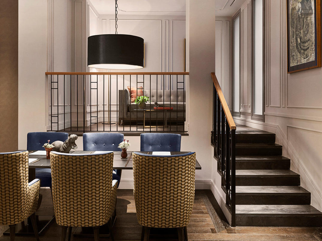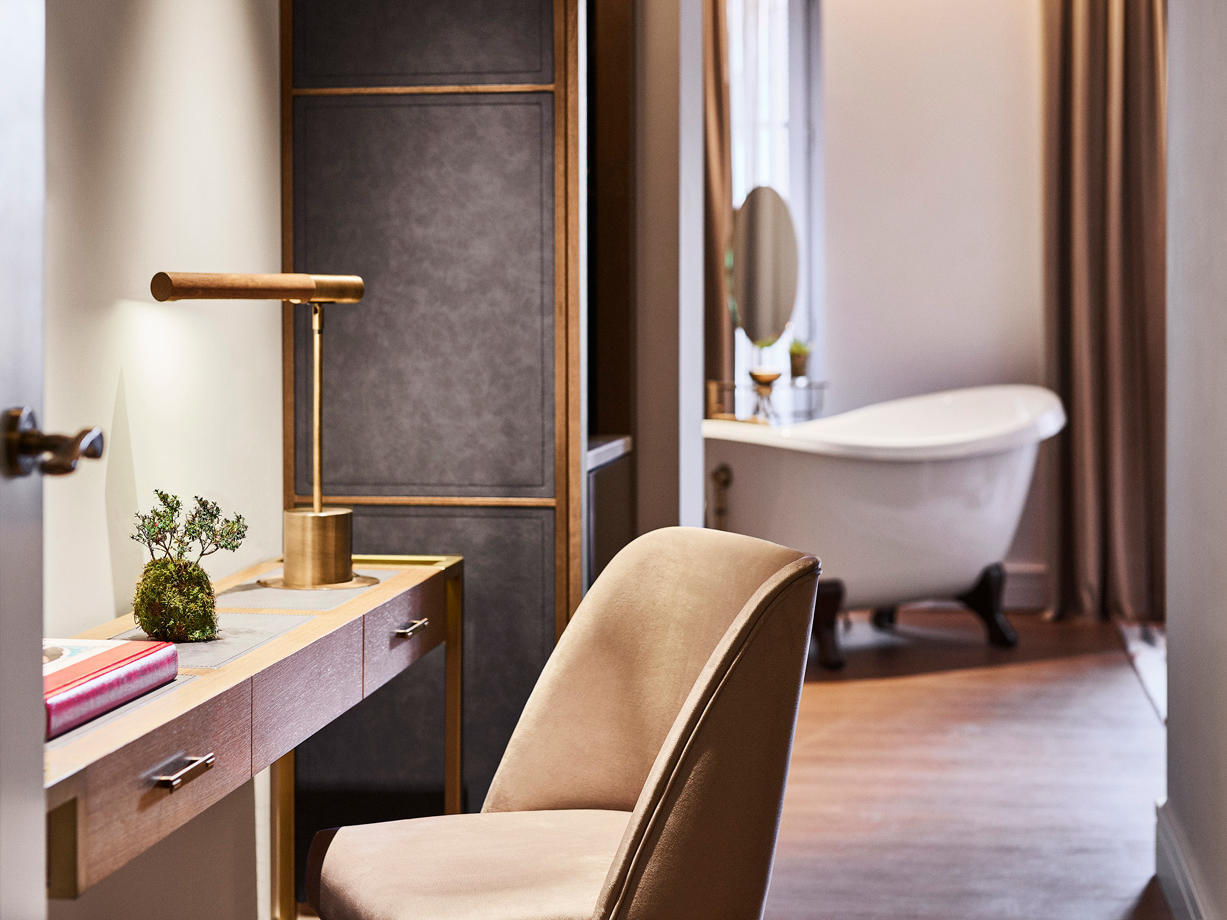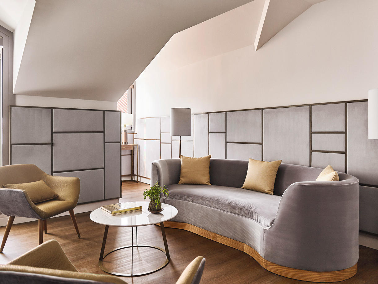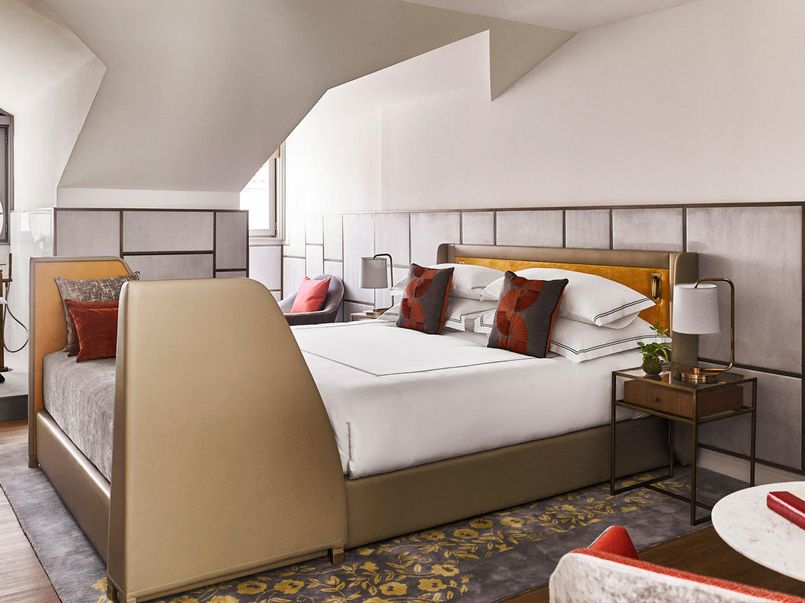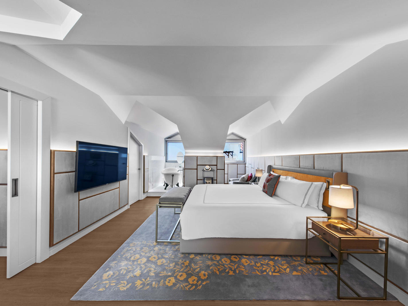 Royal Suite: 125 м2. Фешенебельный номер с мансардными потолками и двумя входами состоит из двух спален с кроватью king-size или двумя кроватями twin и стоящей в комнате ванной в стиле 1920-х годов, просторной гостиной с зоной отдыха и антикварной барной стойкой, столовой, гардеробной, двух ванных комнат с ливневым душем. Номер располагается на верхнем 4 этаже. Максимальное размещение – 5 человек.