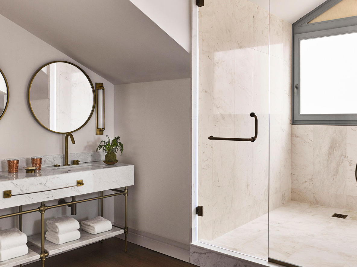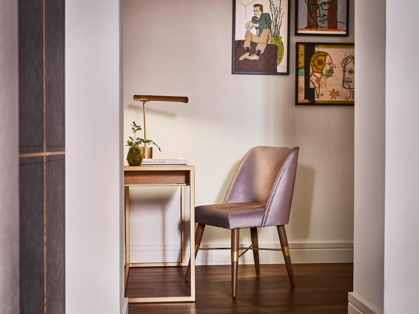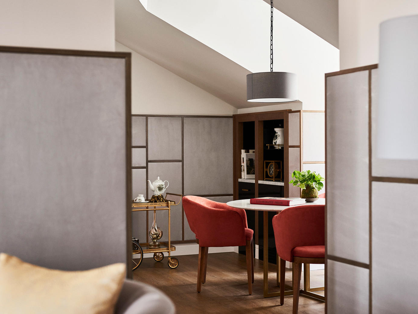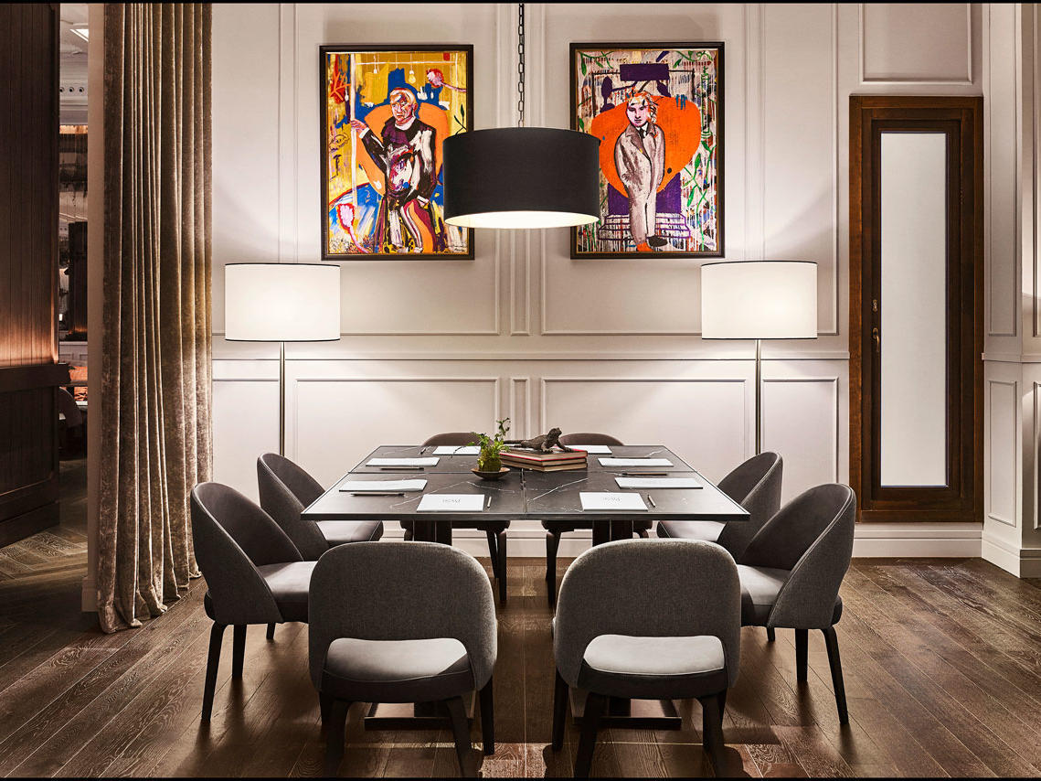 Royal Suite: 125 м2. Фешенебельный номер с мансардными потолками и двумя входами состоит из двух спален с кроватью king-size или двумя кроватями twin и стоящей в комнате ванной в стиле 1920-х годов, просторной гостиной с зоной отдыха и антикварной барной стойкой, столовой, гардеробной, двух ванных комнат с ливневым душем. Номер располагается на верхнем 4 этаже. Максимальное размещение – 5 человек.