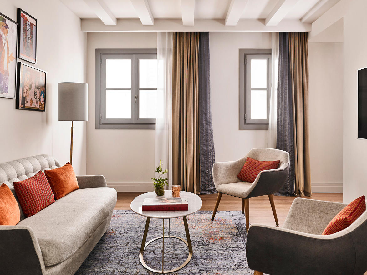 Echegaray Suite: 60 м2. Состоит из спальни с кроватью king-size или двумя кроватями twin и стоящей в комнате ванной, гостиной, двух ванных комнат. Вид на улицу Echegaray и на внутренний двор отеля. Номера располагаются с 1 по 3 этажи. Максимальное размещение – 4 человека.