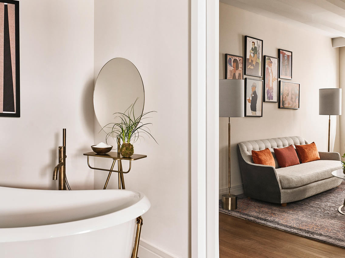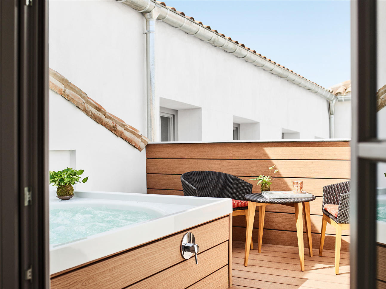 Meller Suite: 50 м2. Состоит из спальни с кроватью king-size и стоящей в комнате ванной, гостиной зоны, ванной комнаты с душем, террасы с джакузи и видом на внутренний двор отеля. Номер располагается на 4 этаже. Максимальное размещение – 2 человека.
