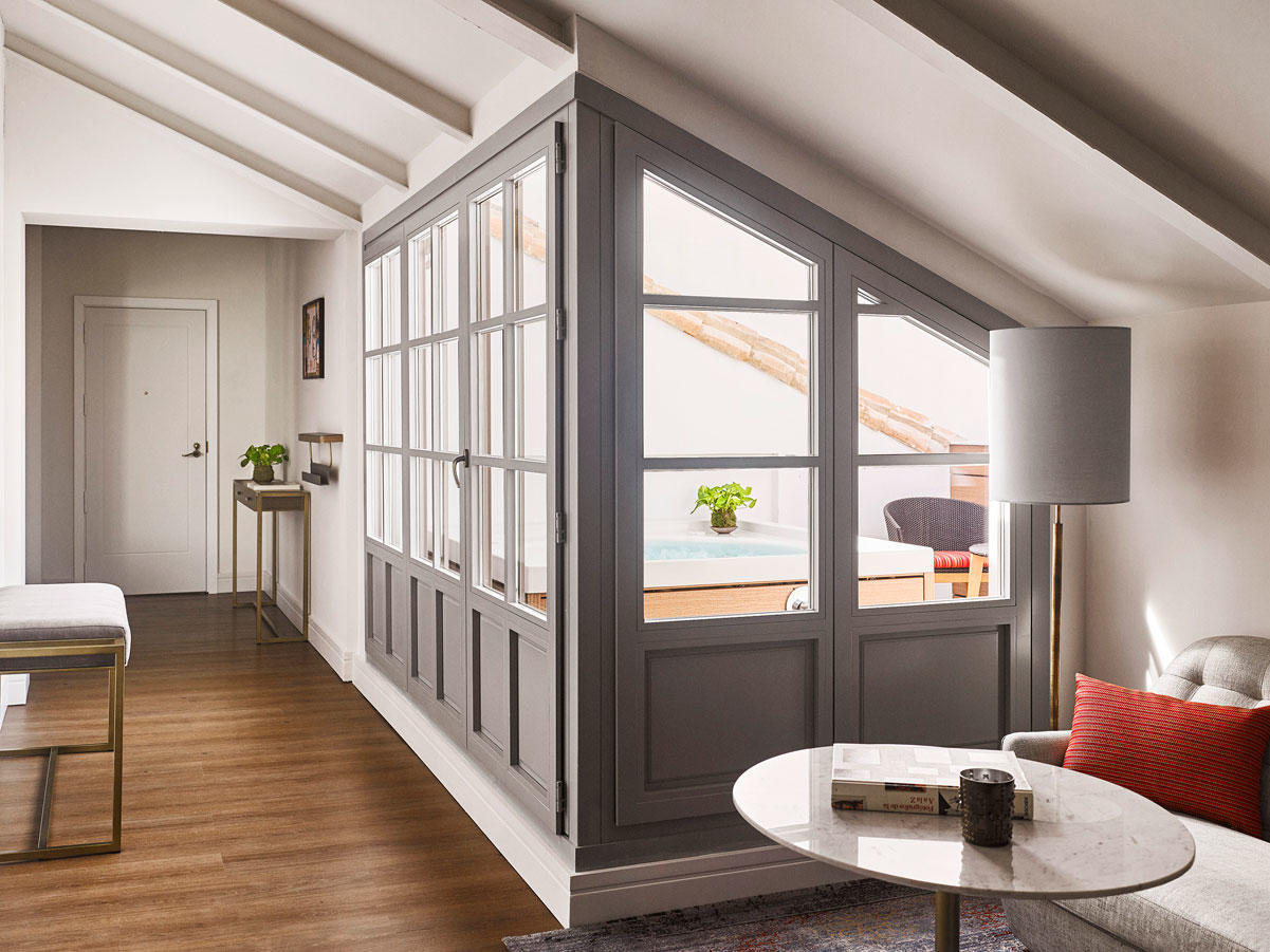 Presidential Suite: 93 м2. Фешенебельный номер с мансардными потолками состоит из спальни с кроватью king-size или двумя кроватями twin и стоящей в комнате ванной в стиле 1920-х годов, просторной гостиной с зоной отдыха, обеденной зоной и антикварной барной стойкой, гардеробной, ванной комнаты с ливневым душем, отдельной туалетной комнаты. Вид на улицу Echegaray и на внутренний двор отеля. Номер располагается на верхнем 4 этаже. Максимальное размещение – 4 человека.