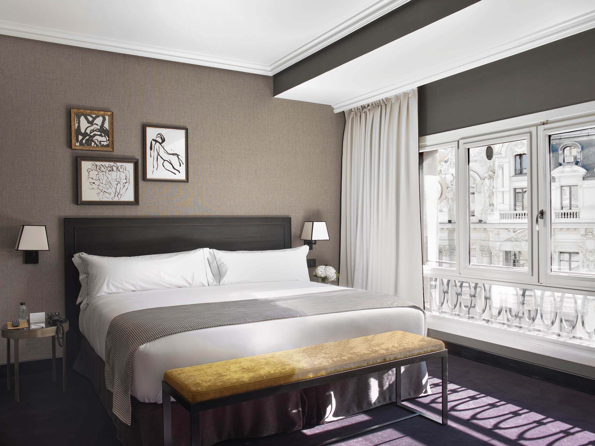 Superior Room: 23 м2. Состоит из спальни с кроватью king-size и рабочей зоной, ванной комнаты с гидромассажным душем. Вид на исторический центр Мадрида. Максимальное размещение – 3 человека.
