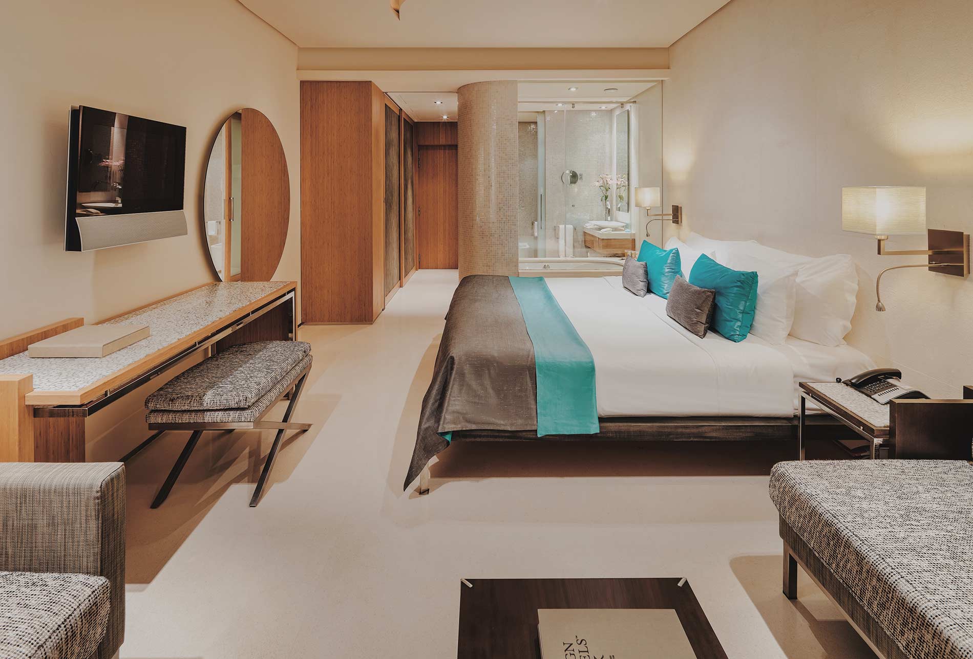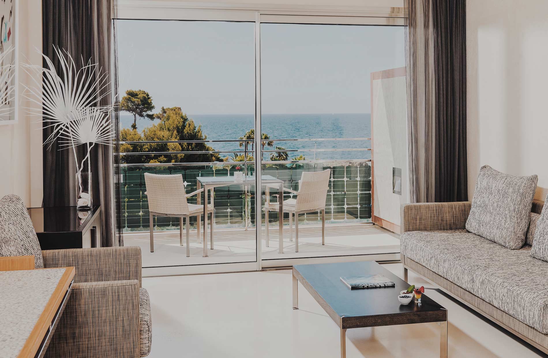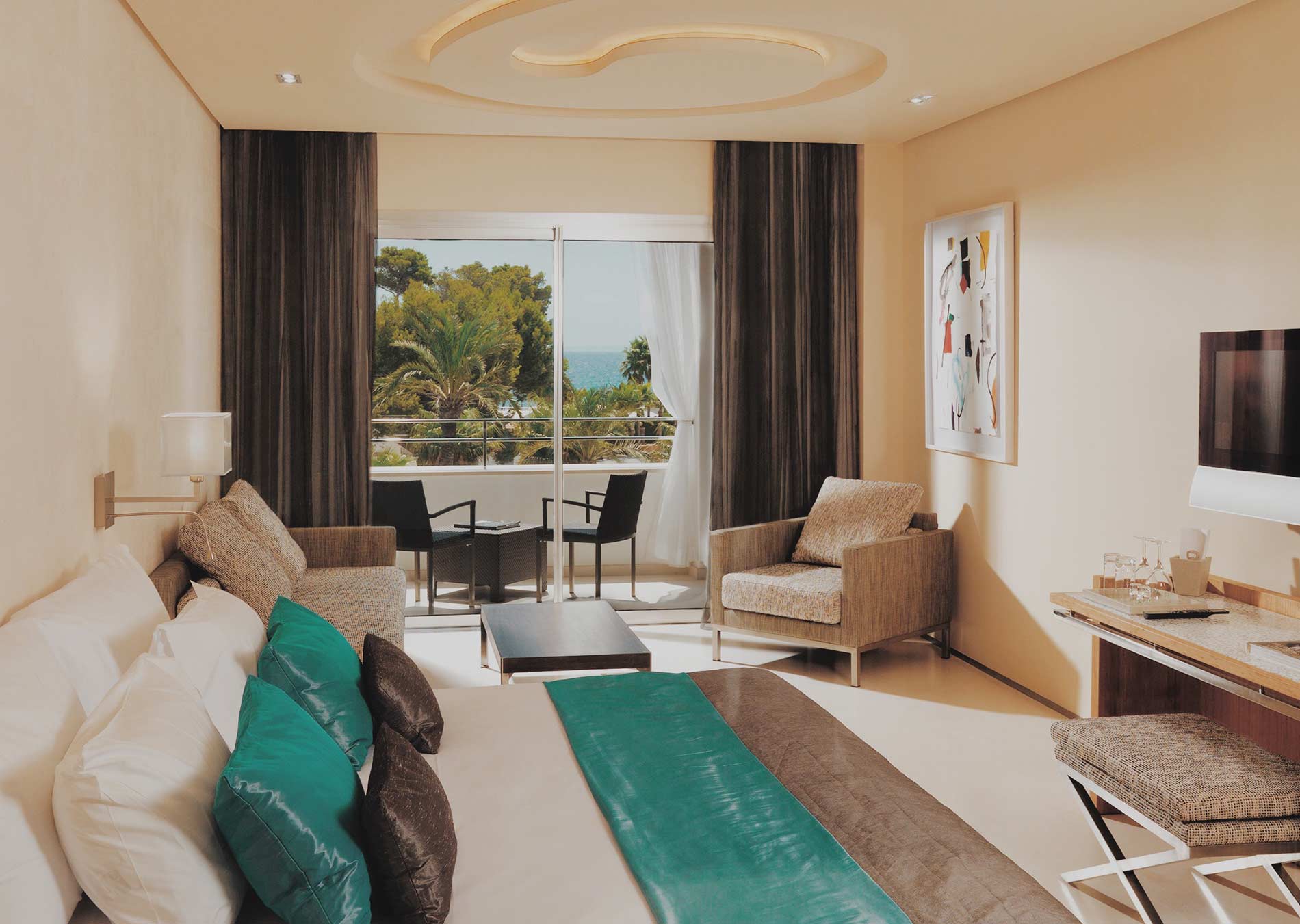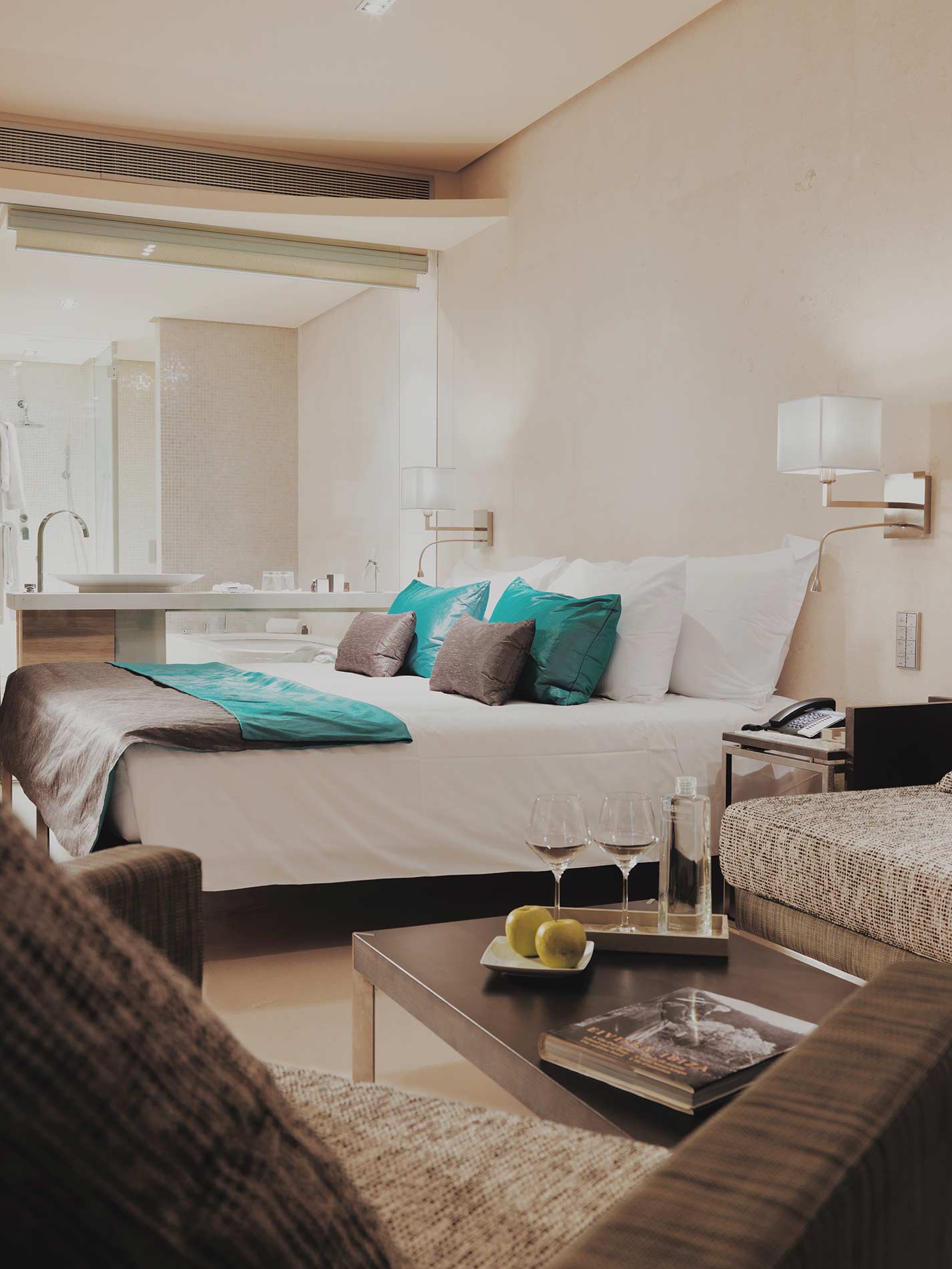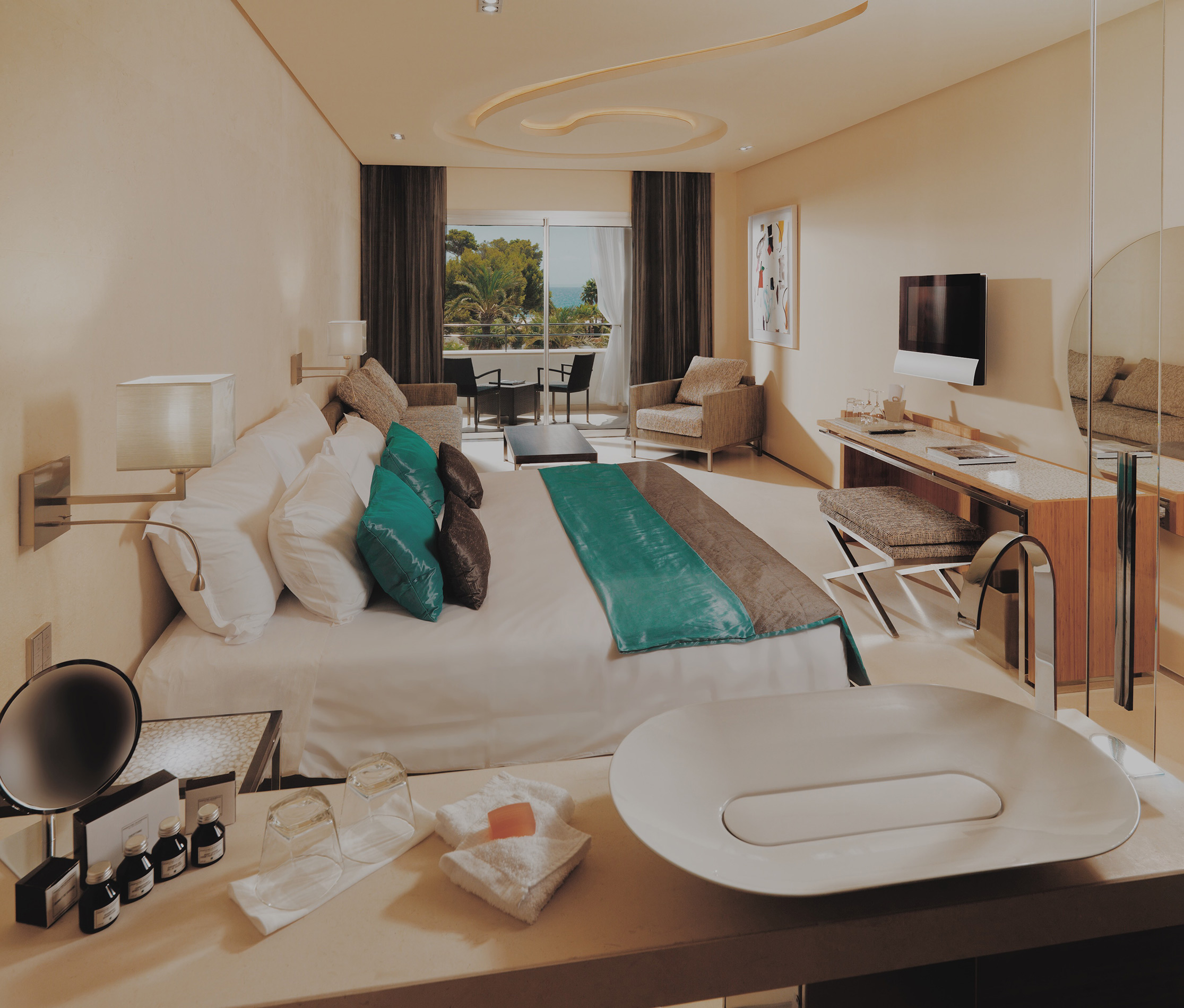 Junior Suite: 38-45 м2. Состоит из спальни с кроватью Кing size или двумя кроватями twin, просторной гостиной зоны, ванной комнаты с ванной, отдельным душем, террасы с видом на бассейн и сады или море.