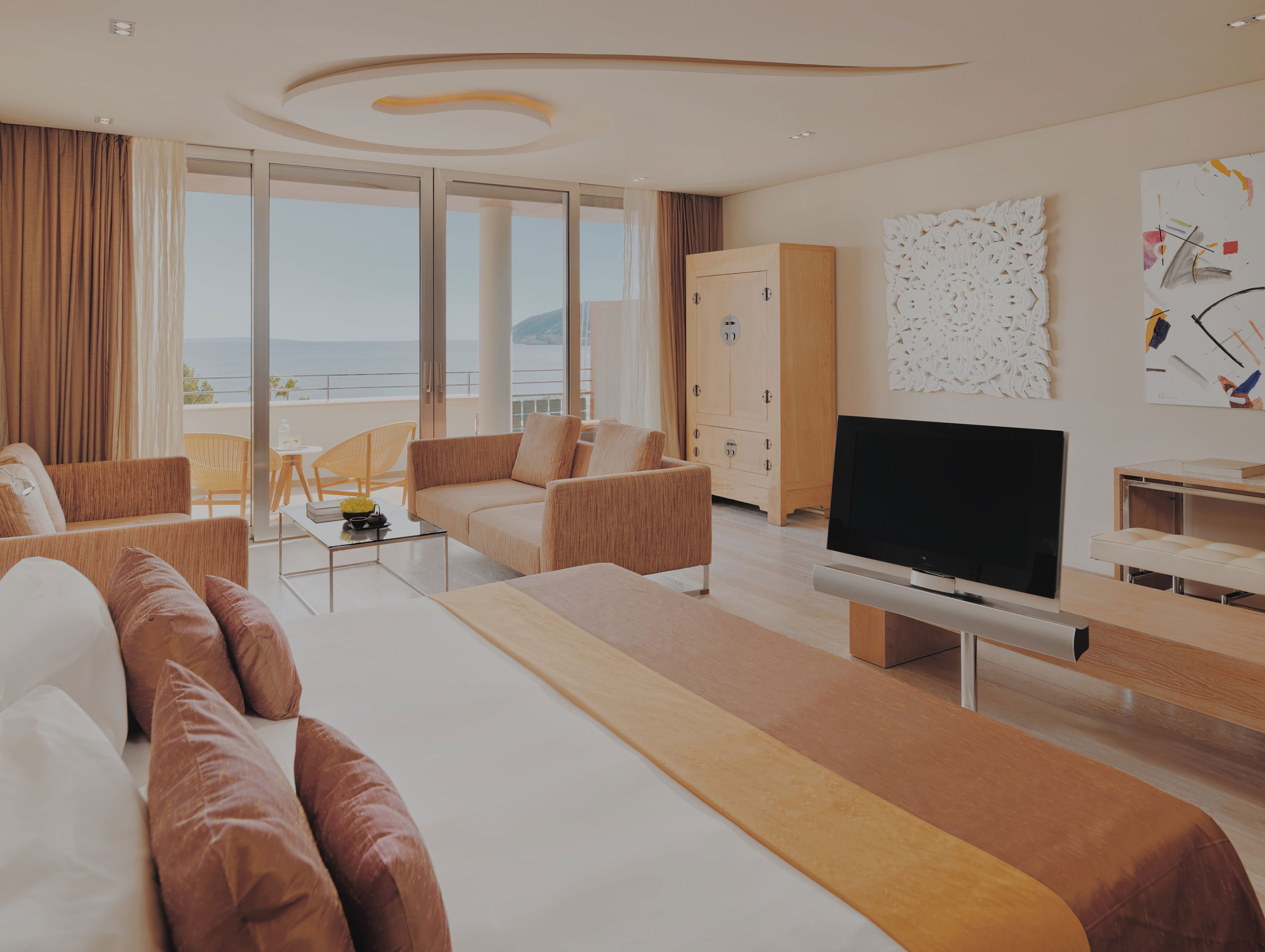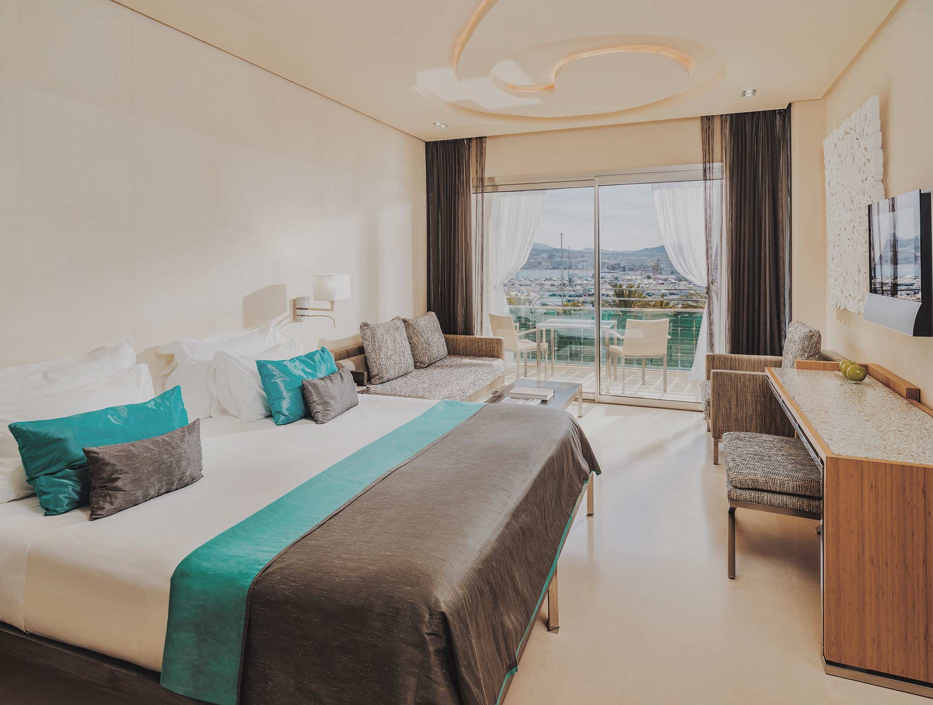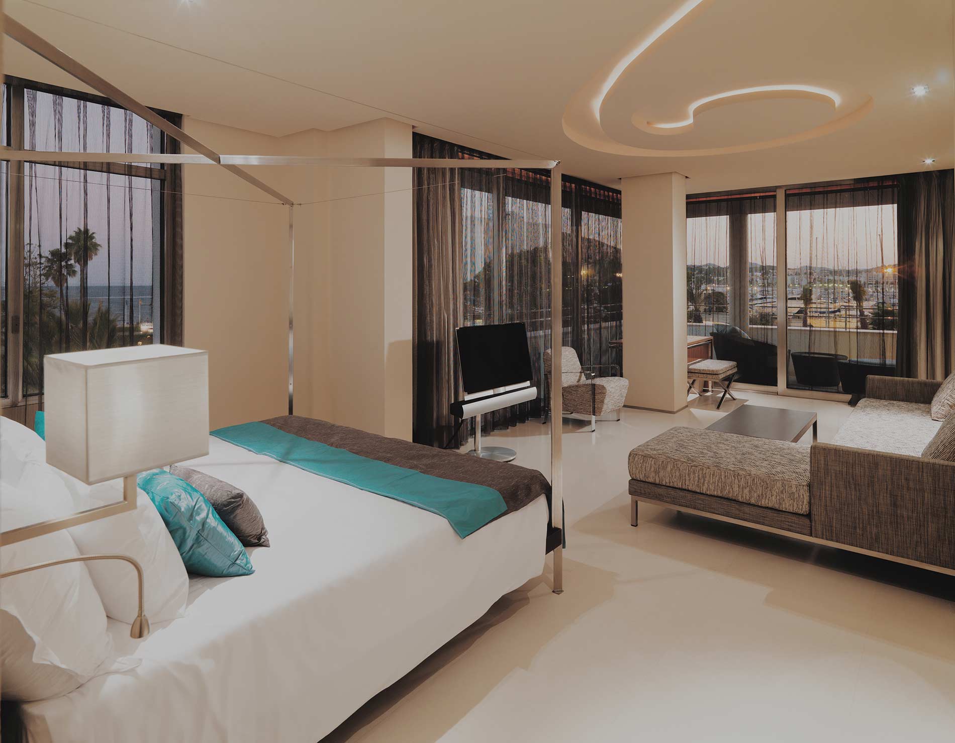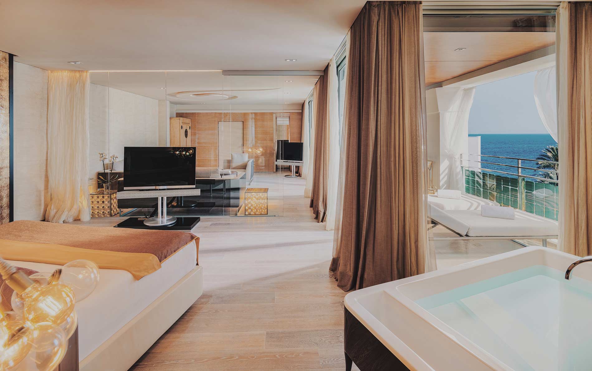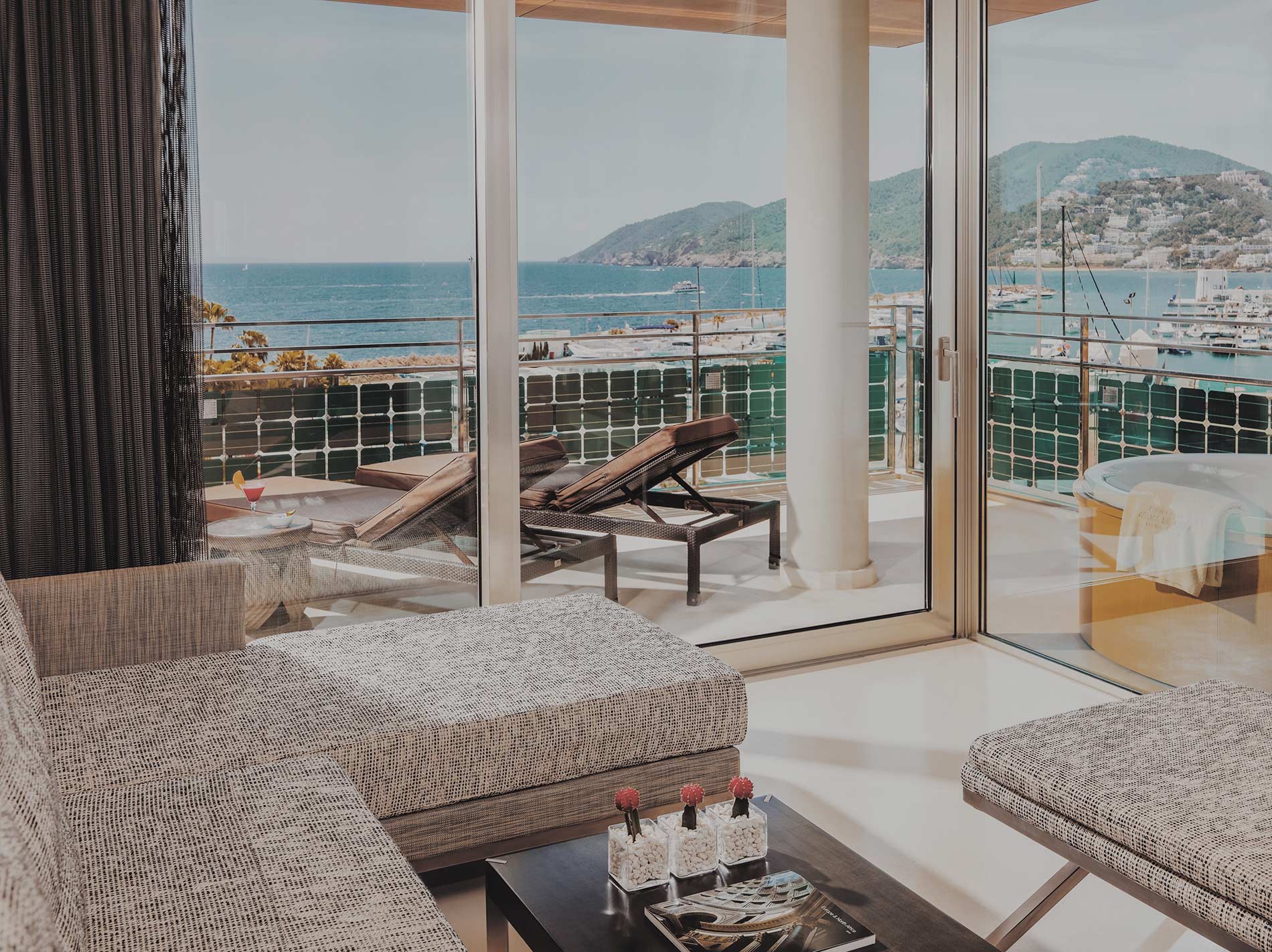 Presidential Suite: 155 м2. Состоит из двух спален с кроватями Кing-size, двух ванных комнат (в каждой — большая ванна и отдельный душ), просторной гостиной, меблированной террасы с джакузи, видом на бухту Santa Eulalia, море и на холмы.