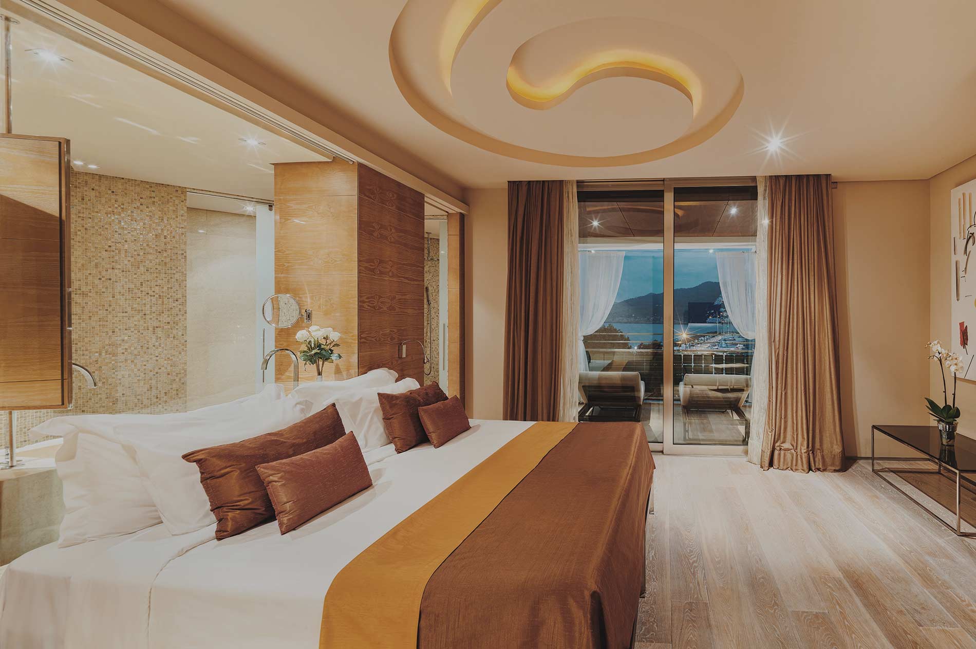 Grand Corner Suite: 87 м2. Угловой номер состоит из спальни с кроватью с балдахином, гостиной, столовой, гардеробной, ванной комнаты, меблированной террасы с джакузи, солярием и панорамным видом на море.
