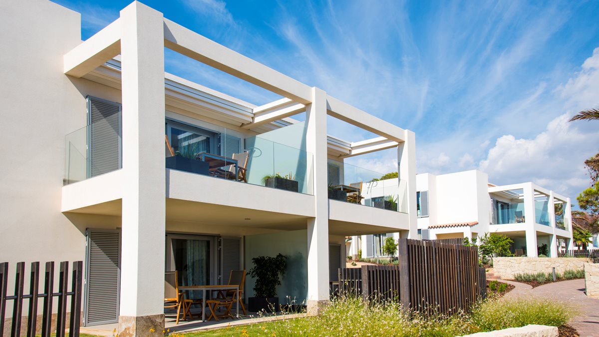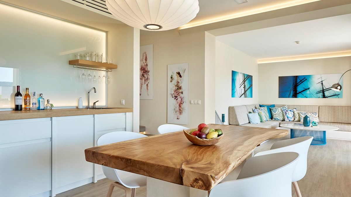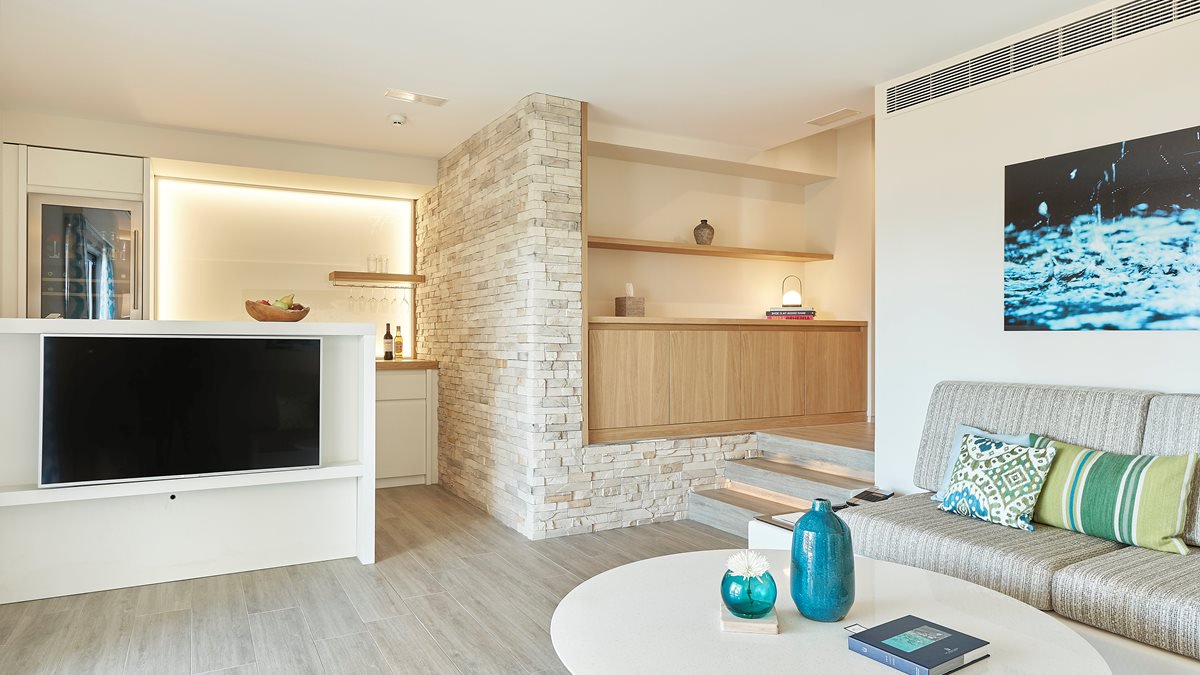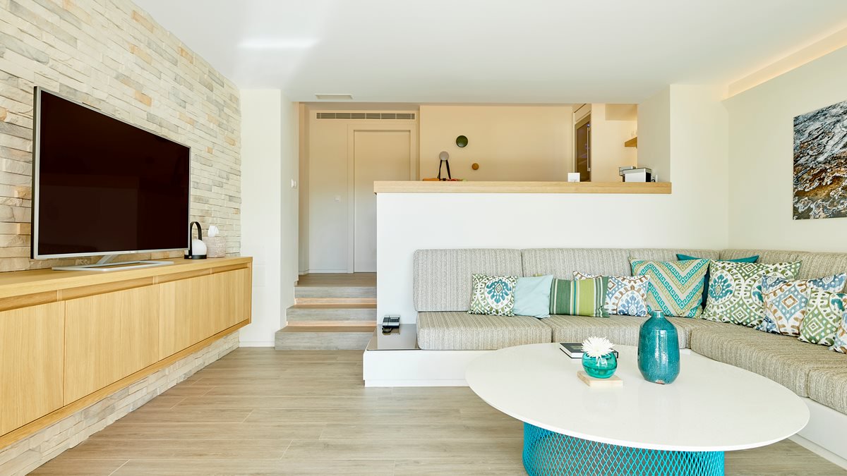 Resort suite sea view (The Ibicenco Village) (54 кв. м): балкон, гостиная, спальня с кроватью king-size или двумя отдельными кроватями, ванная комната. Расположены на втором этаже отдельных корпусов. Частичный вид на море.