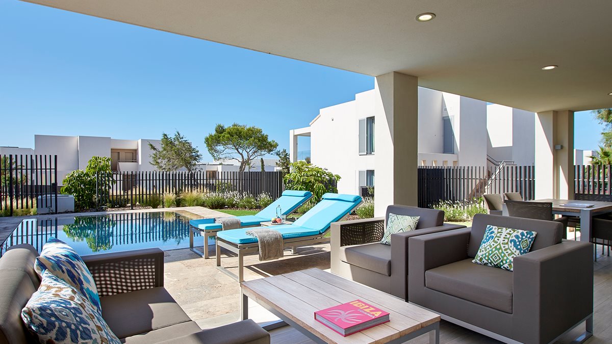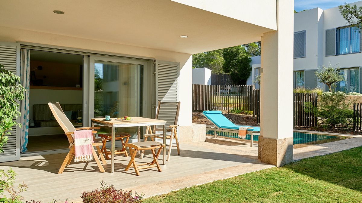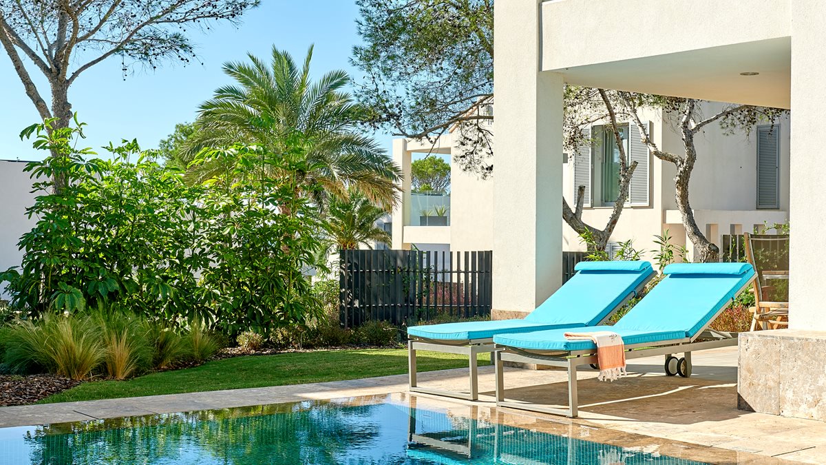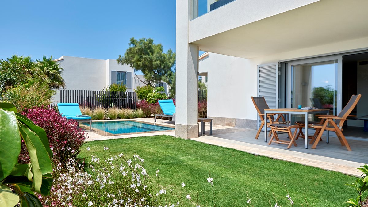 Garden pool suite 2-bedroom (The Ibicenco Village) (119 кв. м): открытый персональный бассейн, терраса с частным садом, гостиная, 2 спальни, 2 ванные комнаты. Расположены на первом этаже.