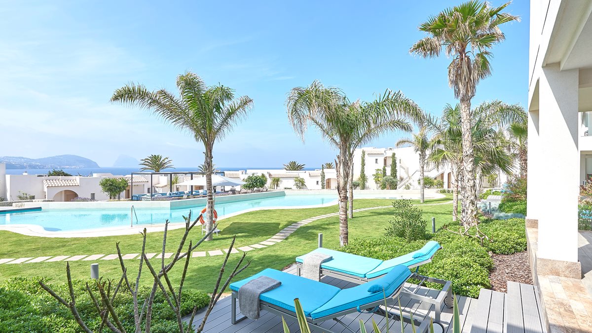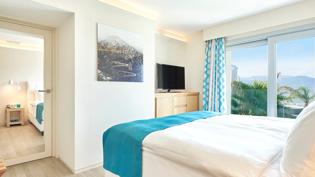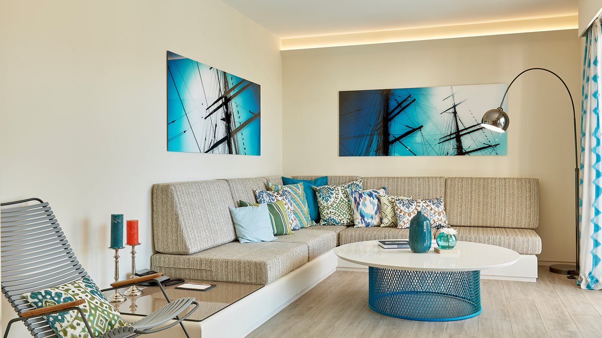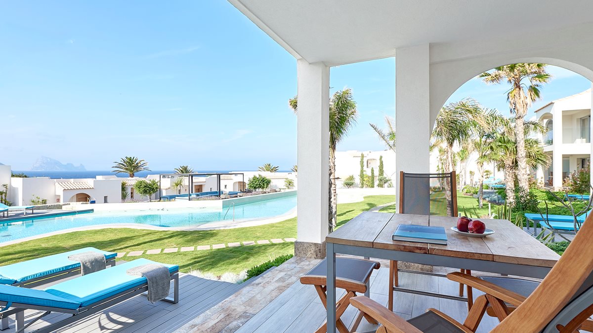 Resort suite sea view deluxe (The Ibicenco Village) (65 кв. м): балкон, гостиная, спальня с кроватью king-size или двумя отдельными кроватями, ванная комната. Расположены на втором этаже отдельных корпусов. Частичный вид на море.
