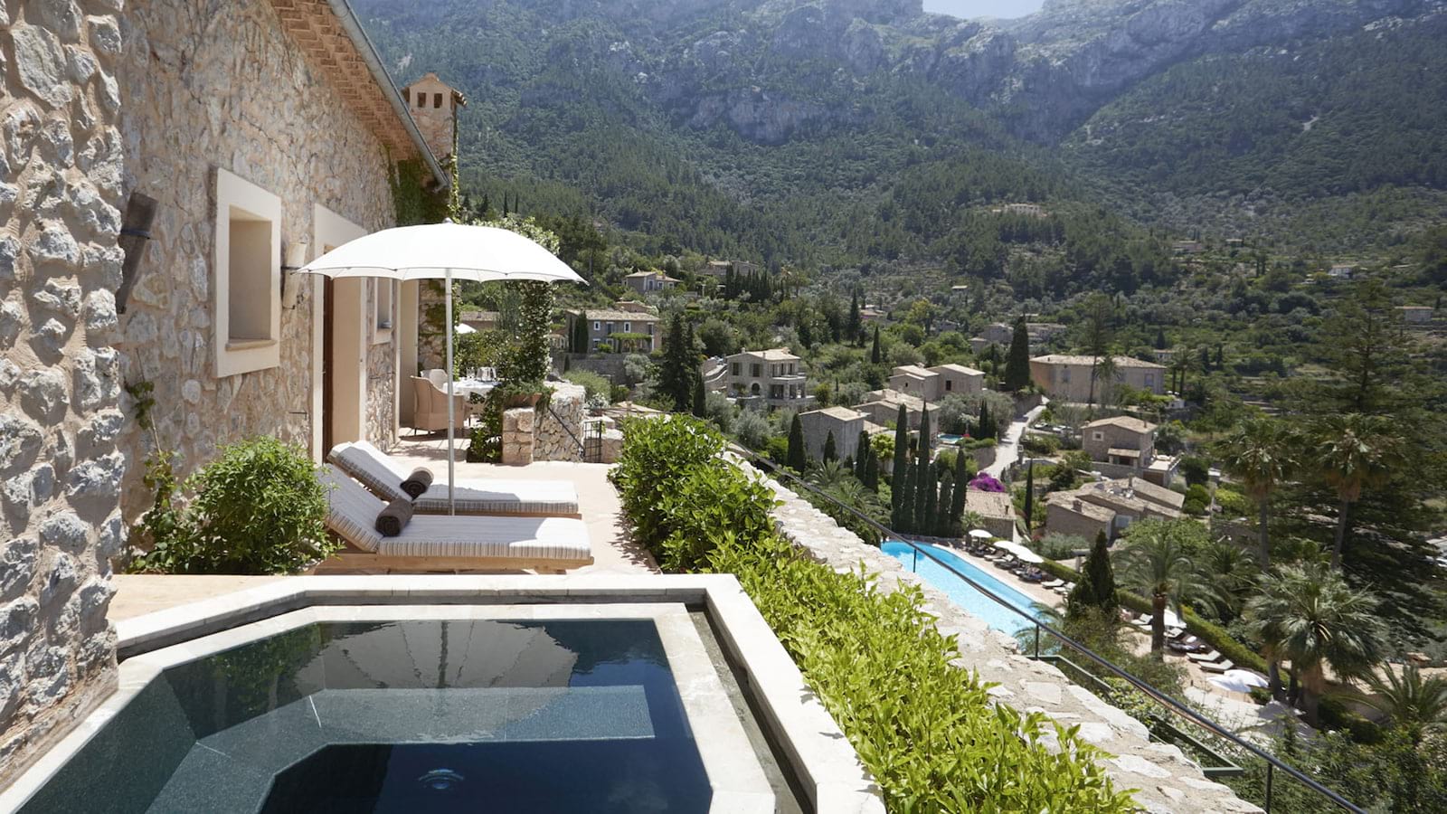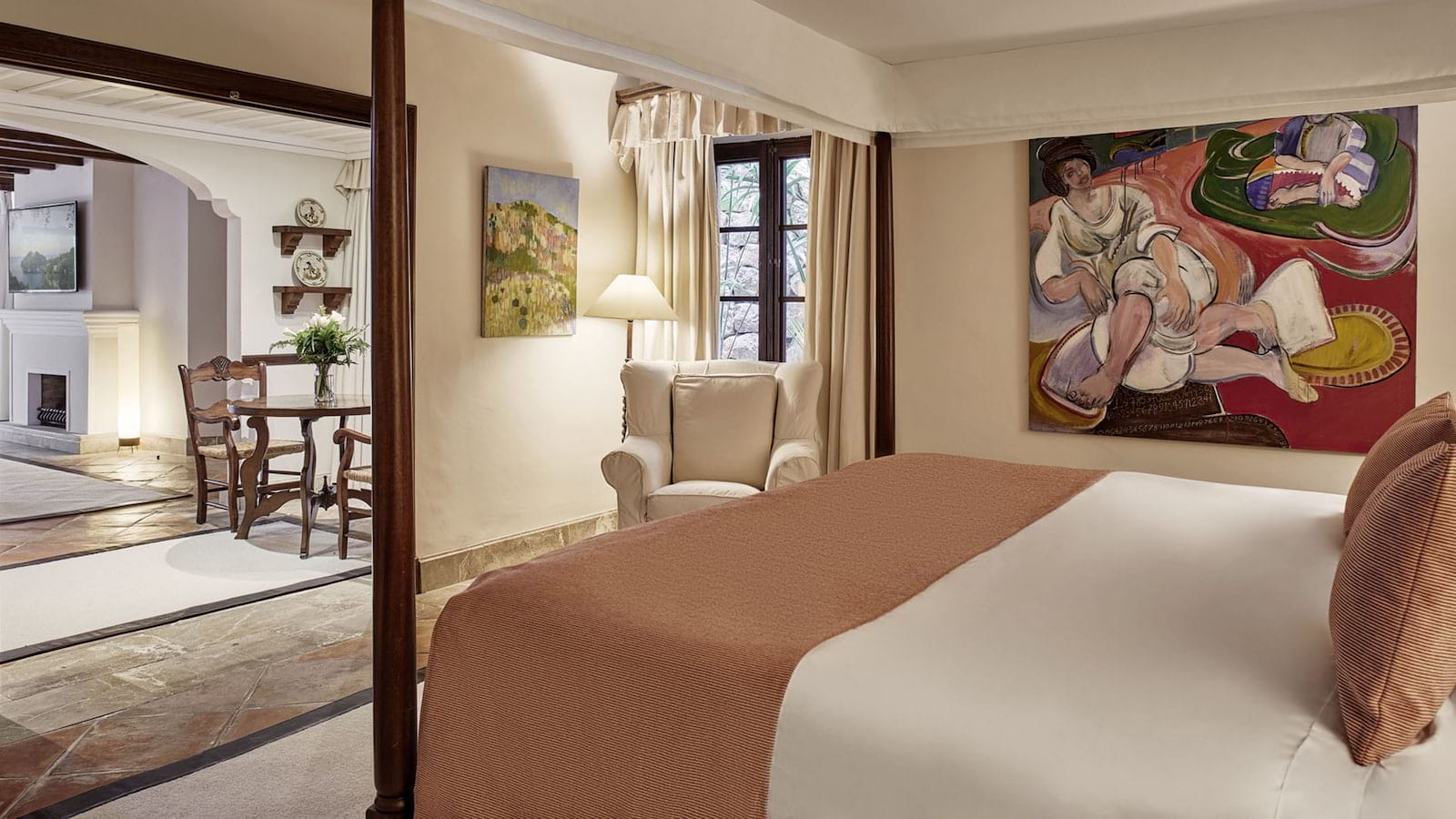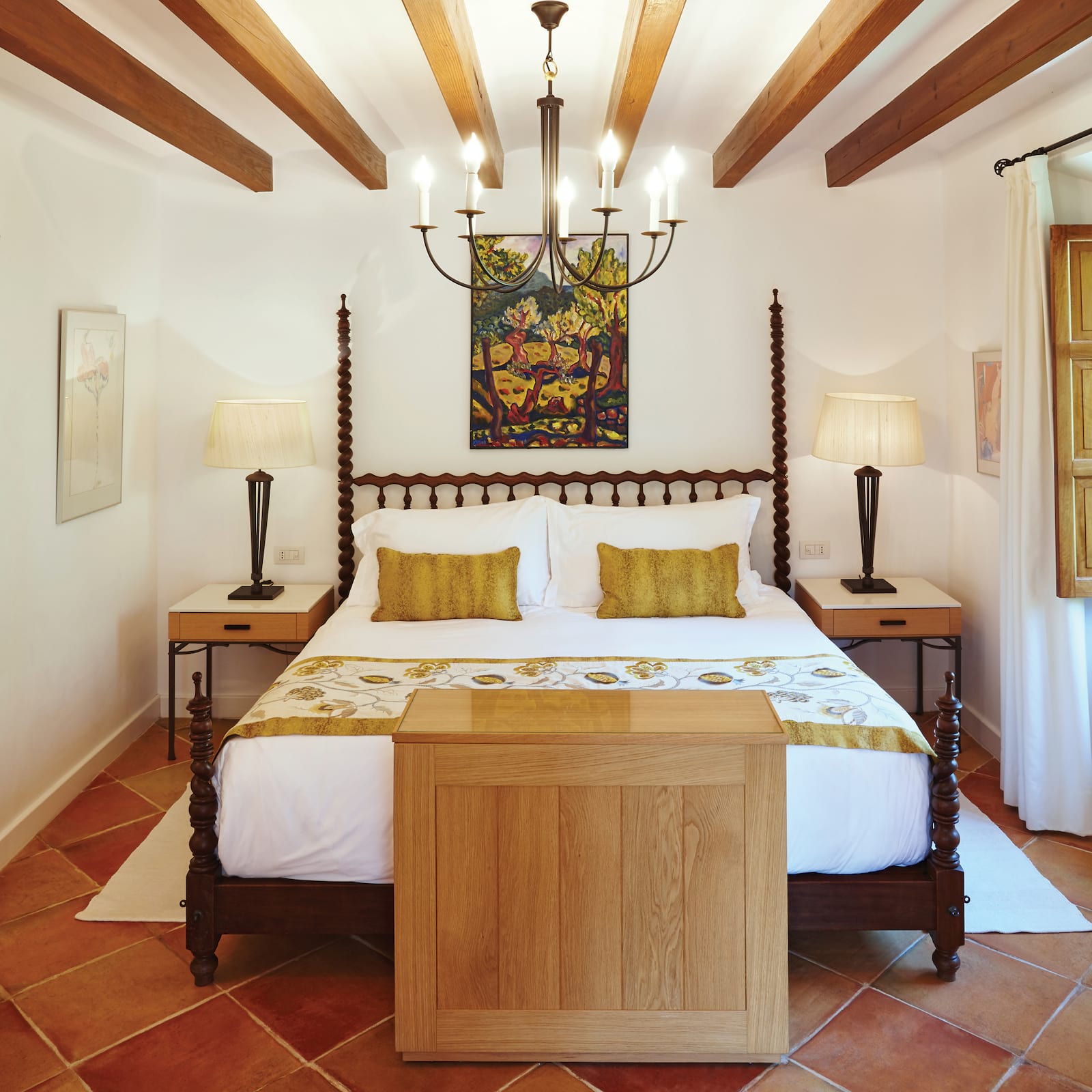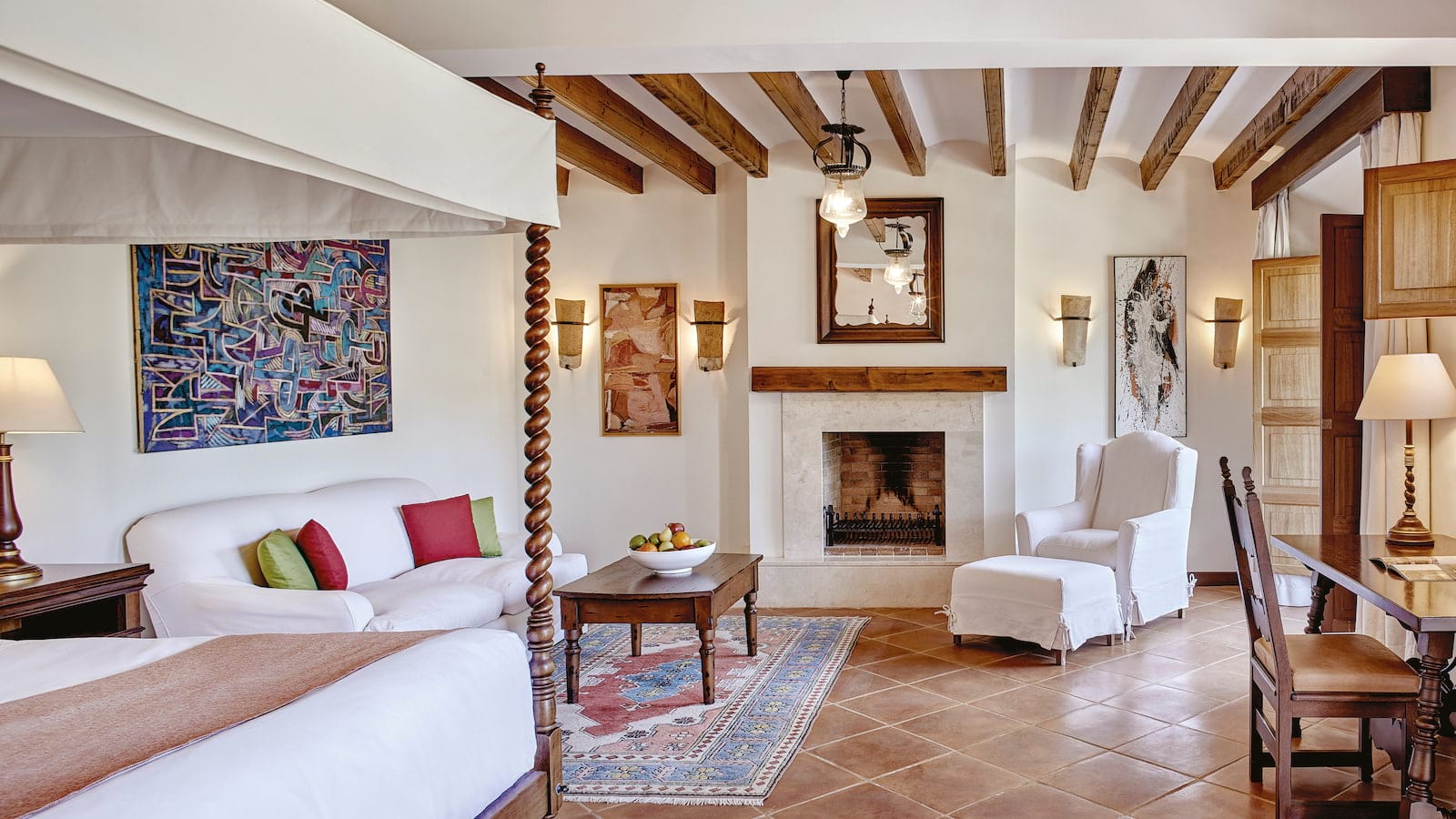 Deluxe Junior Suite: 58 м2. Состоит из спальни с кроватью King-size с пологом, гостиной с диваном и камином, ванной комнаты с ванной и душевой, отдельного туалета, террасы с плиточными полами и великолепным видом на Дейю и горы Трамунтана.