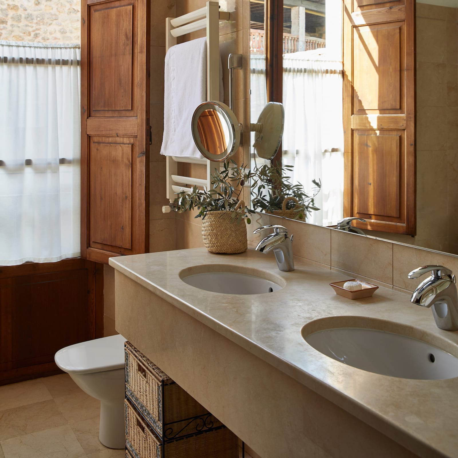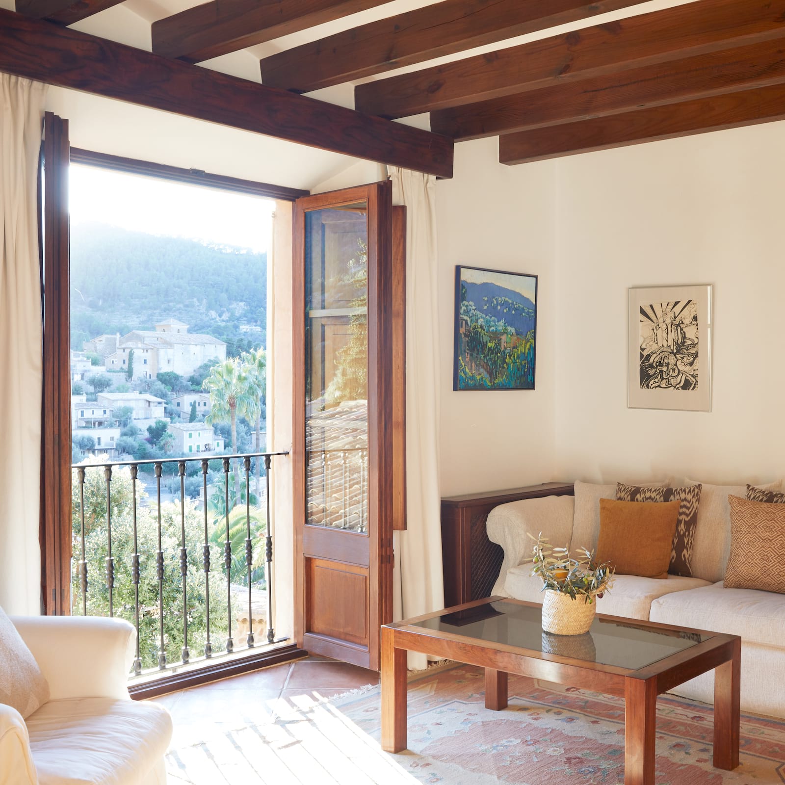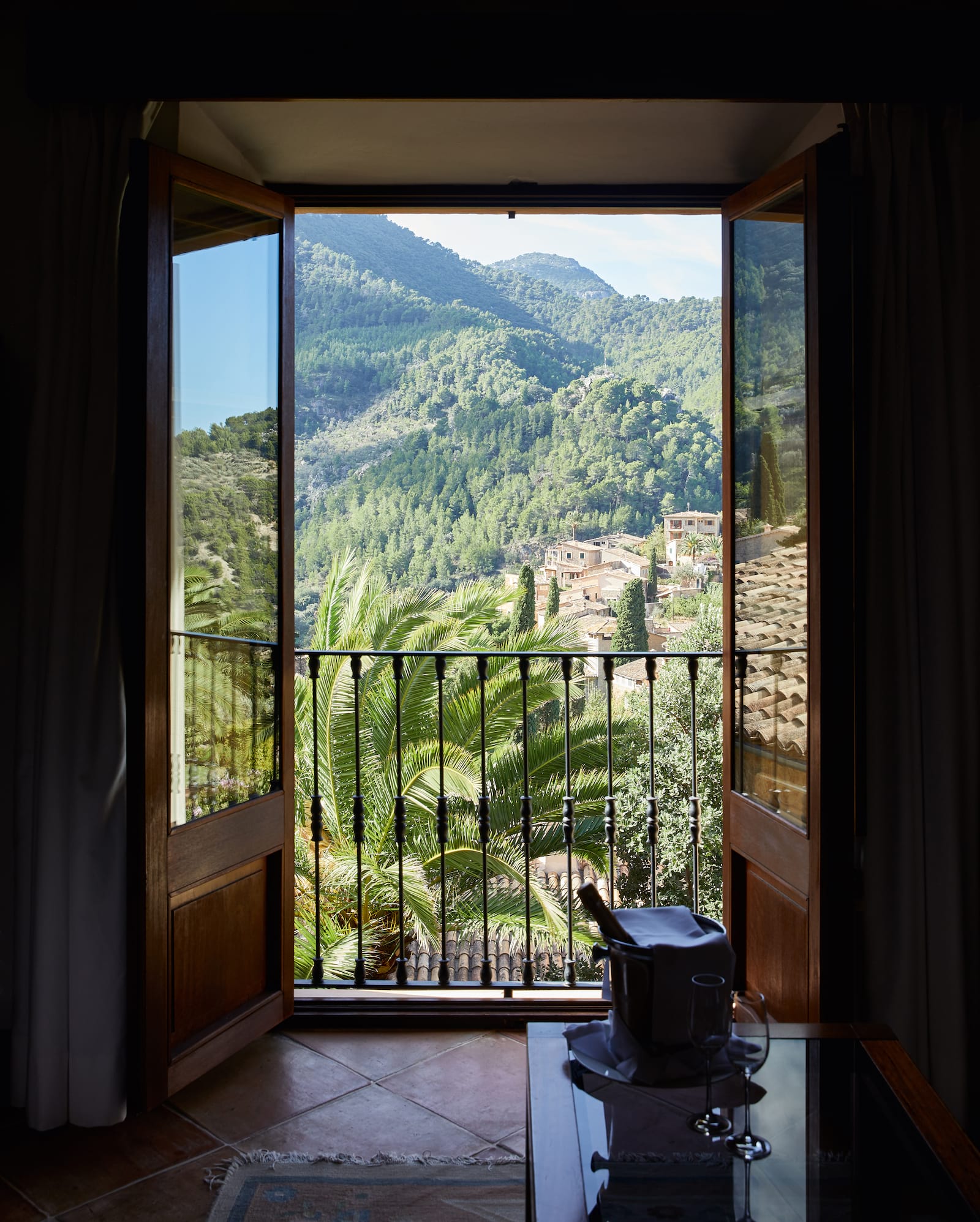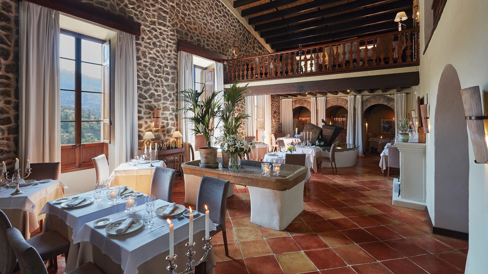 Deluxe Junior Suite: 58 м2. Состоит из спальни с кроватью King-size с пологом, гостиной с диваном и камином, ванной комнаты с ванной и душевой, отдельного туалета, террасы с плиточными полами и великолепным видом на Дейю и горы Трамунтана.
