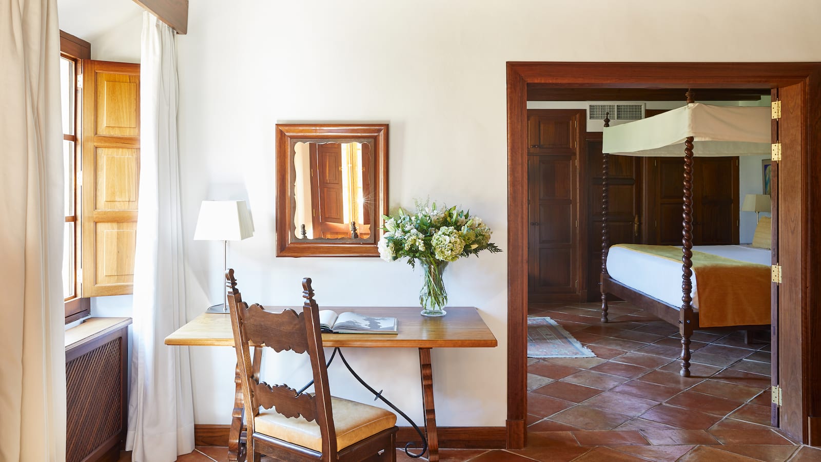 Exclusive Suite: 137 м2. Расположен в здании Son Fony, состоит из спальни с кроватью king-size с пологом, гостиной с диваном, ванной комнаты с ванной и душевой, террасы с садом и бассейном, вид на горы, крытой обеденной зоны на улице.
