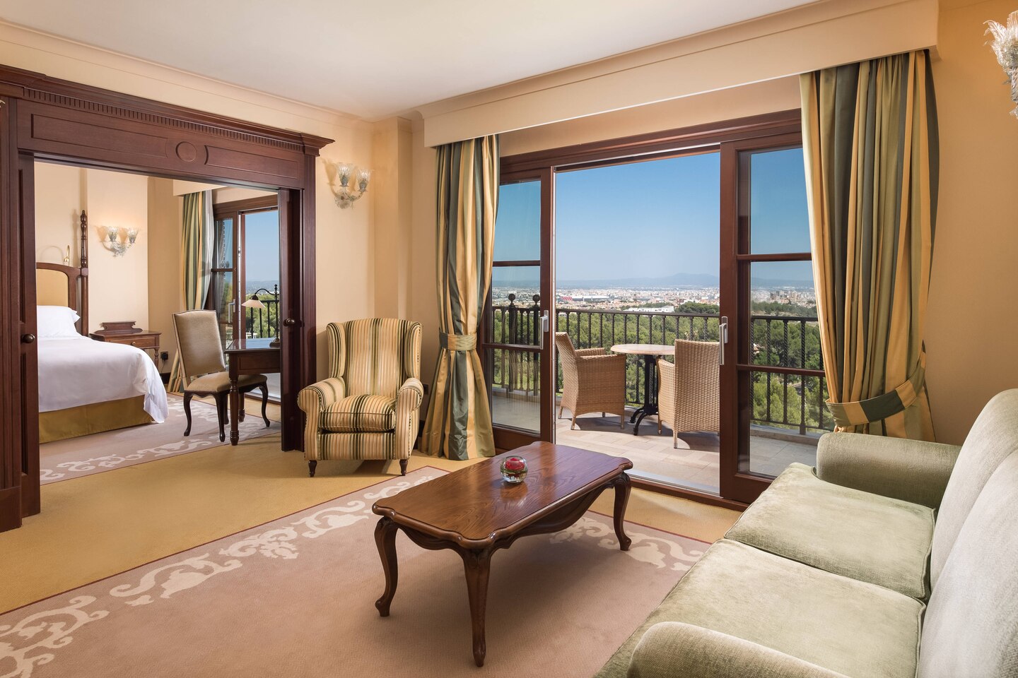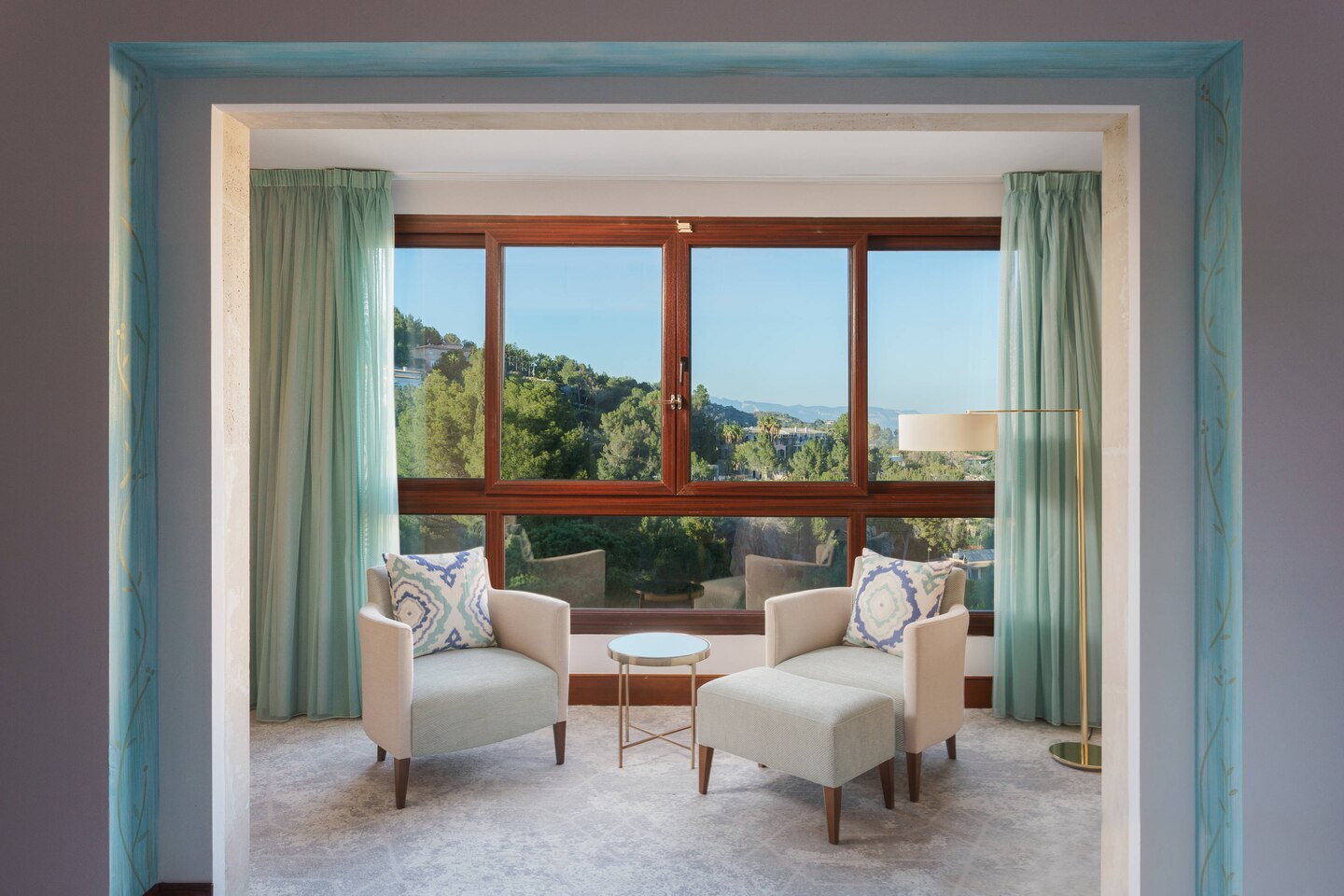 Royal Suite: 132 м2. Роскошный номер состоит из спальни, просторной гостиной, гардеробной, ванной комнаты, гостевой ванной комнаты, просторной террасы с панорамным видом на залив и живописные гольф-поля Son Vida и Son Muntane. Номер может соединяться с Grand Deluxe Room. Максимальное размещение — 2 взрослых + 1 ребенок.