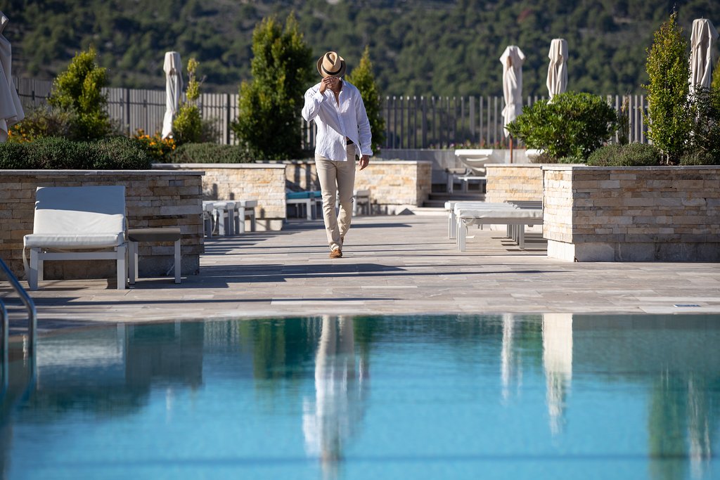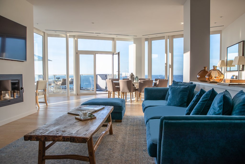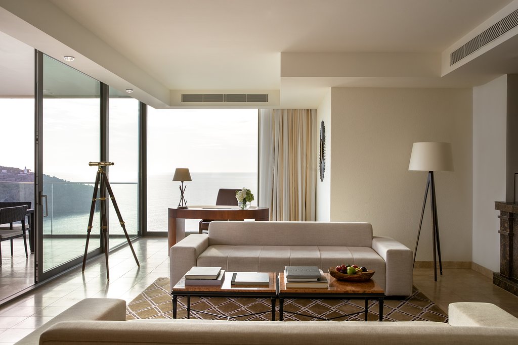 The Mar Blau Suite: 206 м2 + терраса 90 м2. Двухуровневый номер с потрясающим панорамным видом на залив и маяк, состоит из 3 спален, гостиной с обеденной зоной и кухней, гардеробной, 3 ванных комнат, 3  террас с зоной отдыха и частным бассейном. Размещение – 4 взрослых или 3 взрослых+2 ребенка.