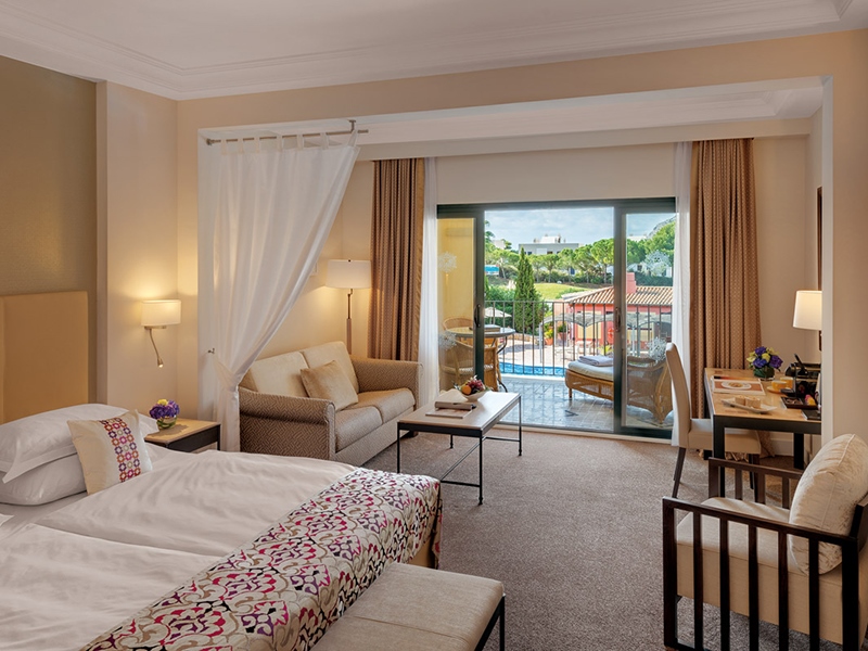 Premium Golf Room: 45 м2. Состоит из спальни с двуспальной кроватью и зоной отдыха, ванной комнаты с ванной/душем, балкона или террасы с видом на голф-поле и горы.