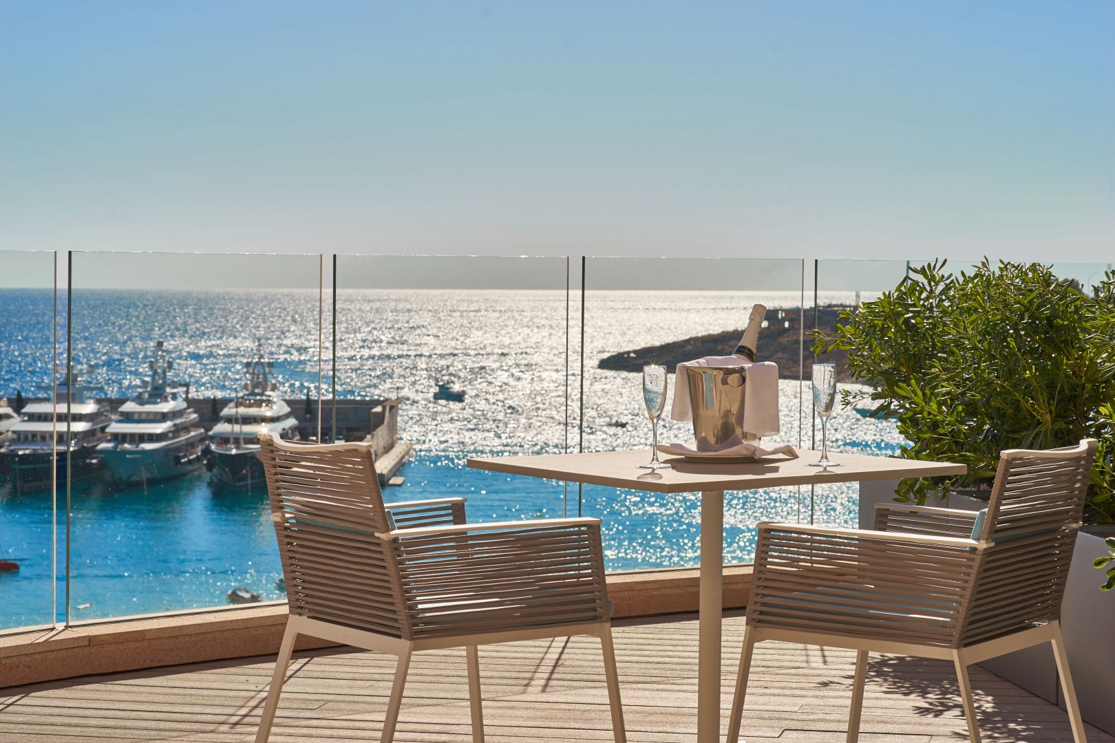 Junior Suite Sea View: 60 м2. Состоит из спальни, гардеробной, просторной гостиной зоны, ванной комнаты с джакузи, террасы с видом на море.