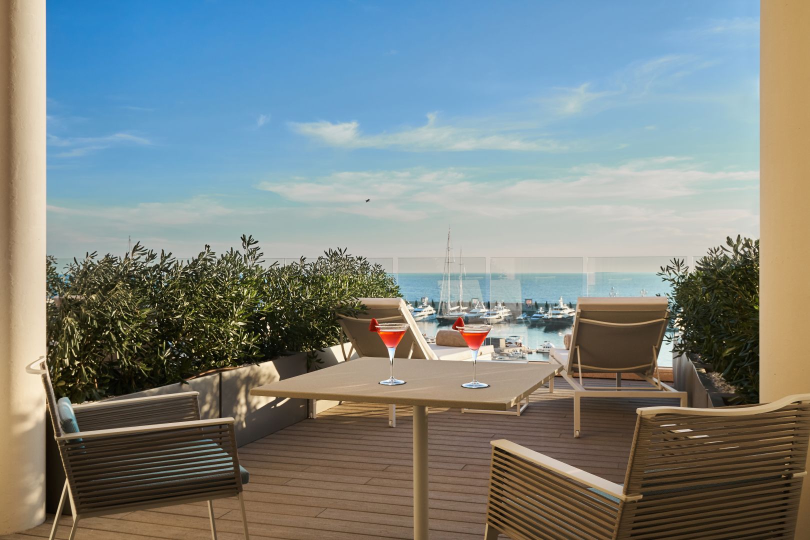 O Suite: 75 м2. Cостоит из спальни, гостиной зоны, ванной комнаты с мини-садом, сауны, джакузи, душевой, террасы с видом на бухту.