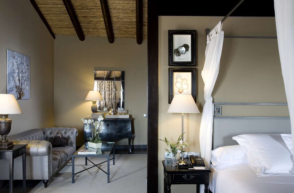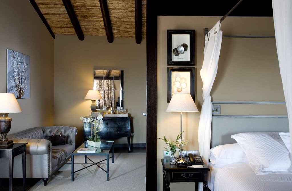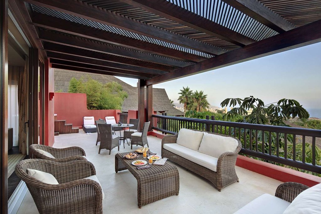 Deluxe Suite with Hot Tub: 100 м2. Состоит из спальни с кроватью king-size с балдахином, гостиной с наклонным потолком, гардеробной, ванной комнаты, большой террасы с зоной отдыха и открытой джакузи, вид на море. Размещение – 2 взрослых + 1 ребенок + 1 младенец.