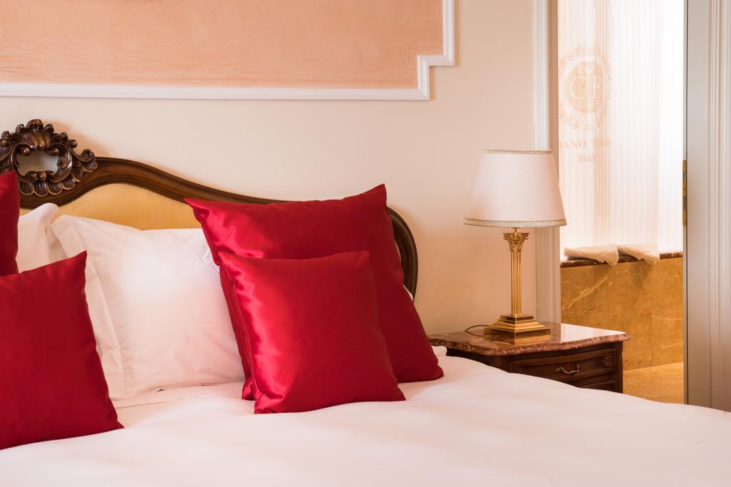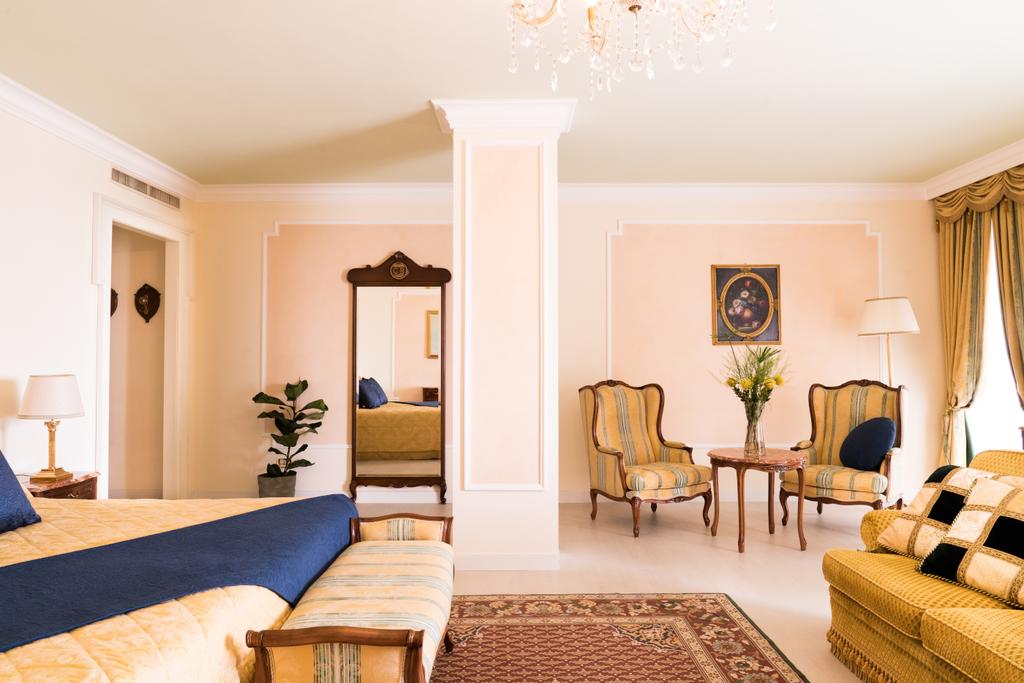 Deluxe Panorama Room: 53 м2. Элегантный номер, обставленный в стиле Людовика XV, состоит из спальни с двуспальной кроватью или двумя кроватями twin, зоны отдыха с письменным столом, отделанной мрамором ванной комнаты с ванной и душем, террасы с панорамным видом на Эуганские холмы, парк и бассейн отеля.