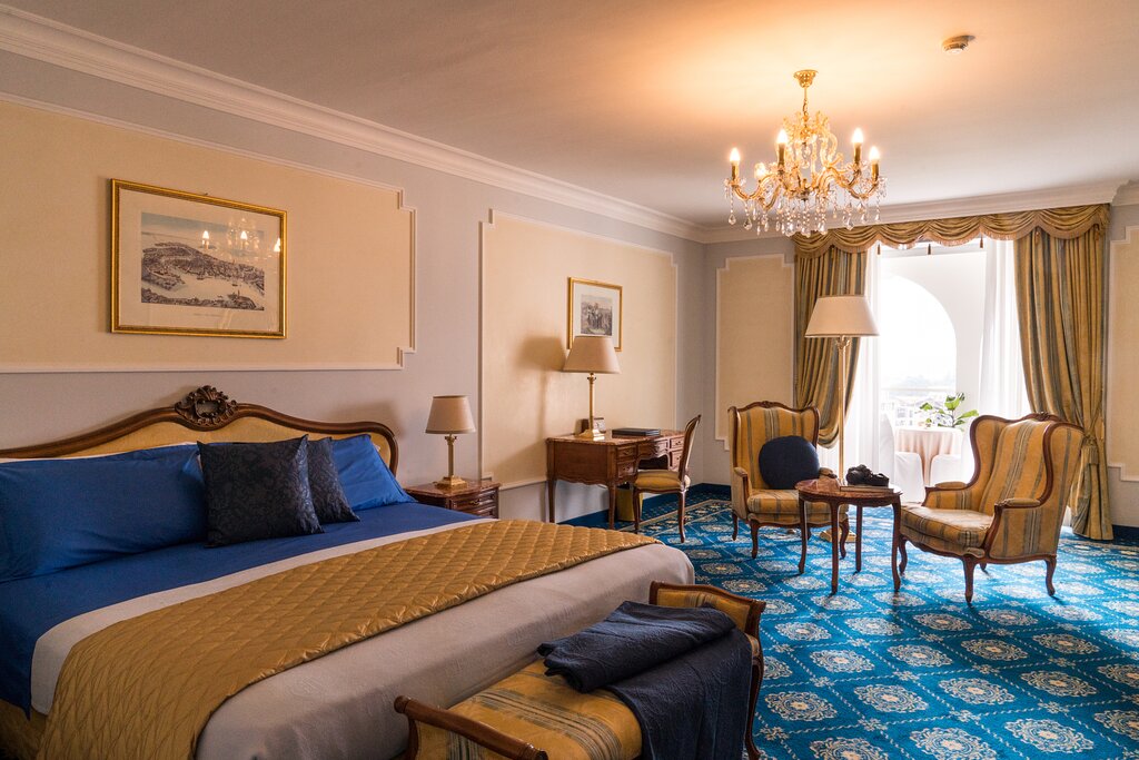 Deluxe Town Room: 53 м2. Элегантный номер, обставленный в стиле Людовика XV, состоит из спальни с двуспальной кроватью или двумя кроватями twin, зоны отдыха с письменным столом, отделанной мрамором ванной комнаты с ванной и душем, балкона с видом на город.