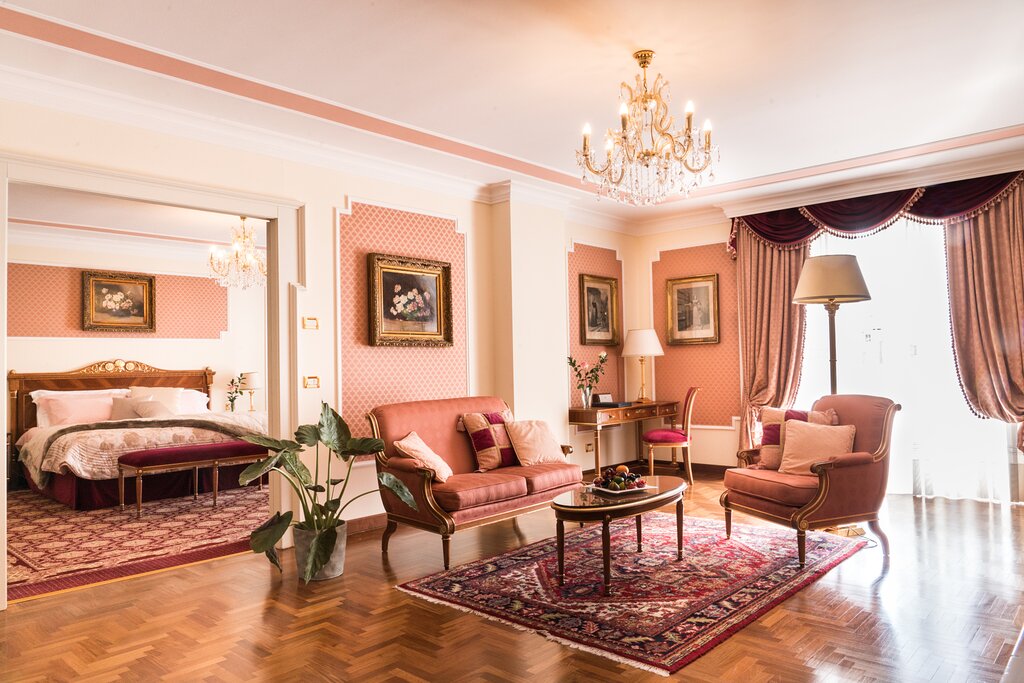 Imperial Suite: 87-107 м2. Номер, обставленный мебелью в стиле Людовика XV, имеет полы из ценных пород древесины. Состоит из спальни с кроватью king-size или двумя кроватями twin, отдельной гостиной с мягкой мебелью и рабочей зоной, гардеробной, отделанной мрамором ванной комнаты с ванной и отдельным душем, двух балконов с видом на город.