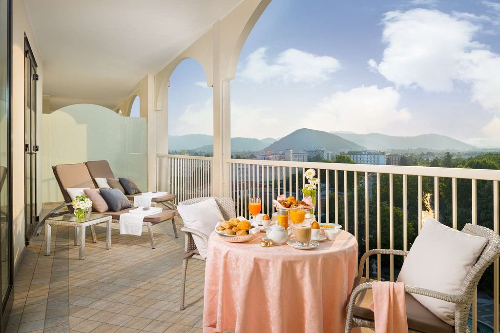Junior Suite: 38-45 м2. Элегантные номера Junior Suite в Абано Терме имеют балкон с видом на сад и четыре термальных бассейна. Номер общей площадью 45 кв м расположен в недавно построенном здании Exclusive. Имеет ковровое покрытие. Интерьеры выдержаны в классическом утонченном стиле. Ванная комната отделана мрамором, имеет душевую кабину и ванную. Возможно заказать номер с большой двуспальной кроватью или двумя раздельными кроватями. Эксклюзивная линейка банных принадлежностей и блюдо с фруктами в качестве VIP welcome в день приезда. Спутниковое телевидение SKY.