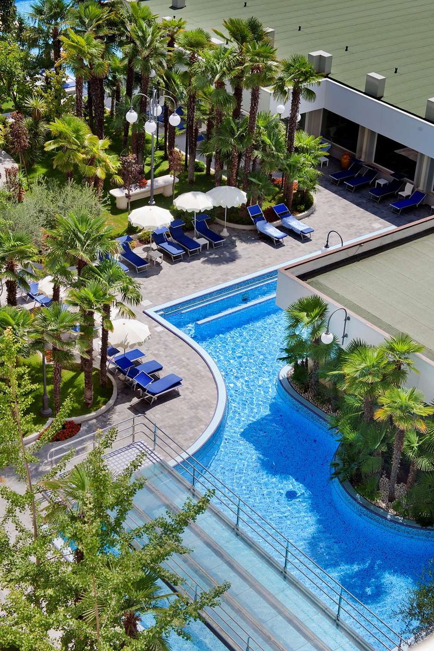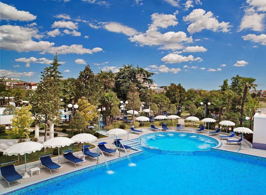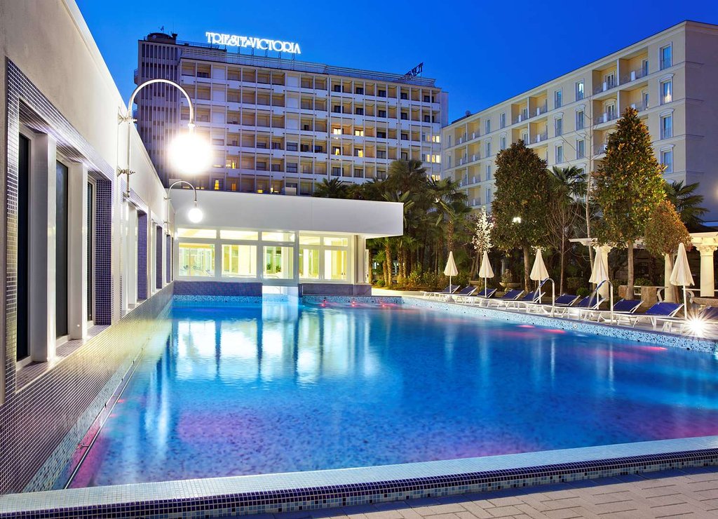 Исторический отель Grand Hotel Terme Trieste & Victoria был возведен еще в 1913 году, и сегодня его элегантный фасад лимонного цвета, окруженный в тропическими пышной зеленью тропических растений благоухающего парка, не может не очаровать проходящих мимо гостей и прибывающих гостей. После масштабной реконструкции, вдохнувшей былую грацию начала прошлого столетия, отель привлекает все больше новых гостей своим гармоничным сочетанием аристократического шарма прежних времен и всеми атрибутами современного комфорта. Здание отеля состоит из трех крыльев, одно из которых историческое. Grand Hotel Terme Trieste & Victoria расположился в большом парке площадью 30 000 кв. м с 888 пальмами, с тремя бассейнами с термальной водой и гидромассажем, дорожкой «здоровья» и водопадами. Особая роль в шикарном убранстве гостиницы отведена изысканному оформлению номеров: изящная мебель, предметы антиквариата, гобелены, дорогие ковры, блестящий паркет, цветочные композиции и коллекция картин — все это наполняет каждый уголок гостиницы атмосферой классической элегантности, придают каждому номеру особый характер и настроение.