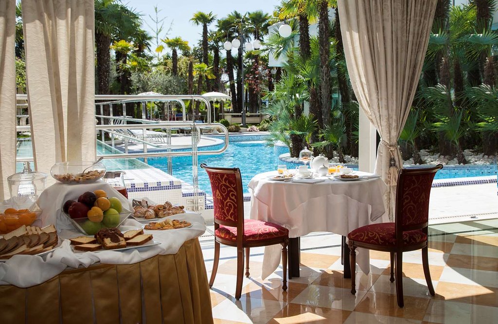 Завтрак подается на террасе с видом на парк и бассейны. Различные виды выпечки и круассаны от кондитеров, овощи и напитки детокс, приготовленные в сотрудничестве с диетологами-нутриционистами.