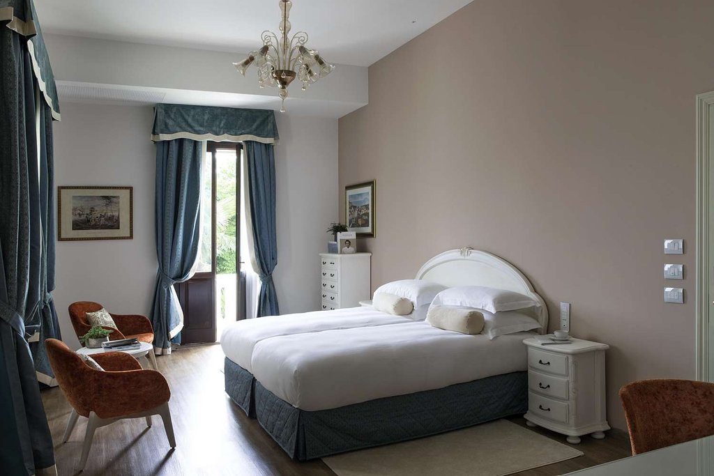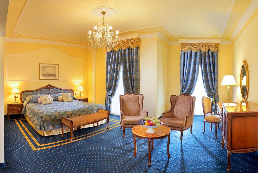 Imperial Suite: 64 м2. Эти эксклюзивные сьюты расположены на верхних этажах здания Elegance отеля Grand Hotel Trieste & Victoria и отличаются элегантностью, спокойной атмосферой и роскошными интерьерами. Площадь 64 кв.м. Номер состоит из гостиной с удобными креслами, зоной кабинета и туалетным столиком, а также гостевым туалетом, облицованным ценными породами мрамора. Просторная спальня соединена с ванной комнатой, оборудованной всеми удобствами и облицованной зеленым и розовым мрамором, в которой расположены душевая кабина и ванная. Большая панорамная терраса с захватывающим видом на северную часть отеля: сад, пешеходную зону и Эуганские Холмы на горизонте. Вид на южную часть: четыре термальных бассейна и вечно зеленый сад 20.000 кв м. Особо внимательная заправка кровати. ВИП-приветствие с фруктами и просекко.