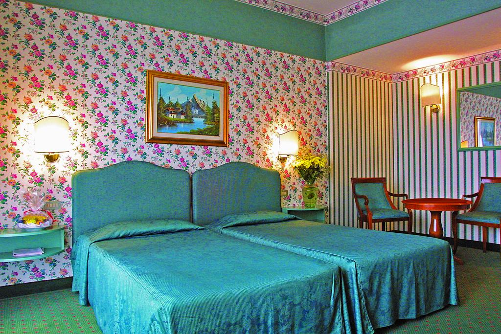Deluxe: 30 м2. Просторный спокойный номер с балконом с видом на бассейны и Эуганские холмы. В номере ванная комната с ванной и/или душевой кабиной, фен, автономный кондиционер, прямая телефонная линия, кабельное телевидение, радио, мини-бар, сейф. Ковровое покрытие или паркет. Возможность разместить третью кровать.