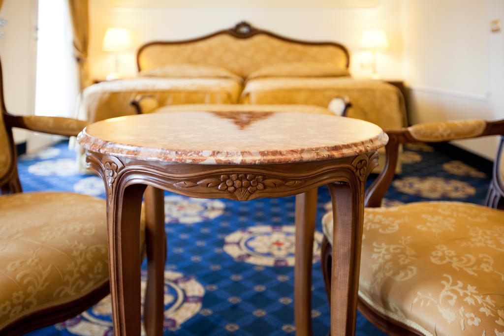 Senior Suite: 60 м2. Роскошный и просторный номер с балконом с видом на термальные бассейны и парк. Номер в стиле Людовика XV. Номер располагает зоной кабинета с письменным столом, диван и кресла, обеденный стол и две ванные комнаты, облицованные мрамором, с душевой кабиной и ванной. Возможность добавить третью и четвертую кровати.