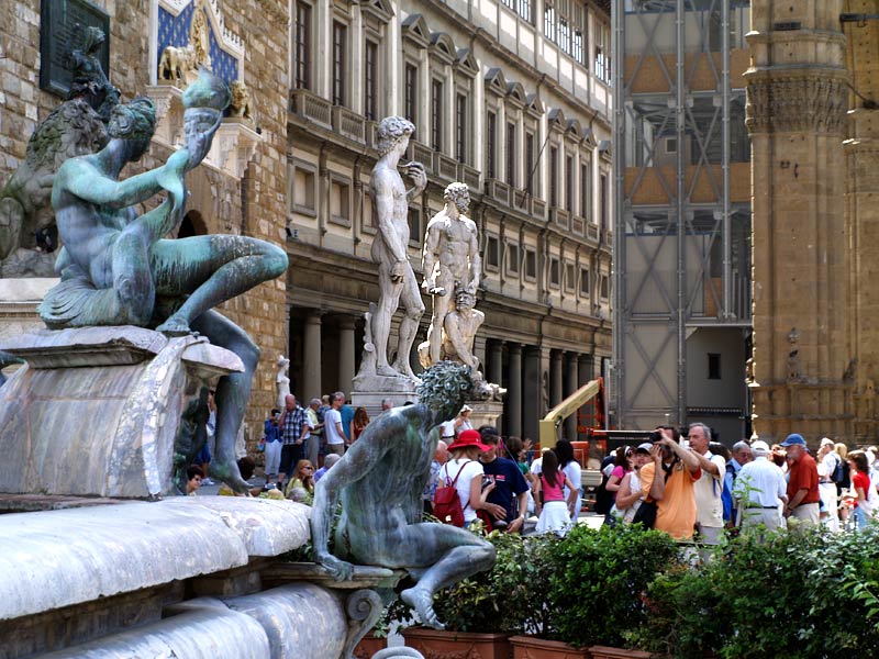 Слева от дворца находится живописный фонтан Нептун, богато украшенный скульптором Бартоломео Амманнати и его помощниками (1563-1575 годы). В центре фонтана - огромная фигура морского бога из белого мрамора, возвышающаяся на колеснице, запряженной четверкой морских коней. Флорентийцы нарекли эту огромную белую статую "Бьянконе" (Белый гигант), и название это за ним сохранилось. Особый интерес представляют также прекрасные бронзовые скульптуры у основания фонтана. <br>