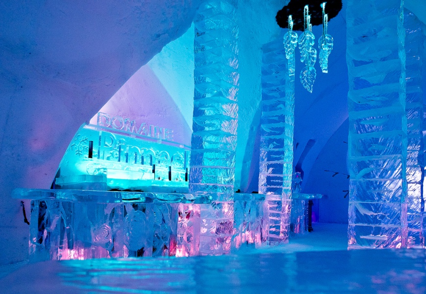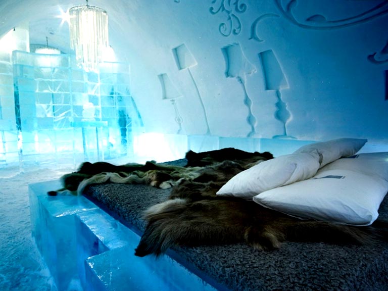 Ледяные отели - это уникальный способ отдыха зимой. В них в полной мере раскрывается экзотика севера. Ледяные помосты, застеленные шкурами, в качестве кроватей, ледяная мебель, ледяные картины и статуи. Средняя температура в номере отеля иглу – около -4С. Оформление иглу донельзя скромное – никаких телевизоров, радио и Интернета.